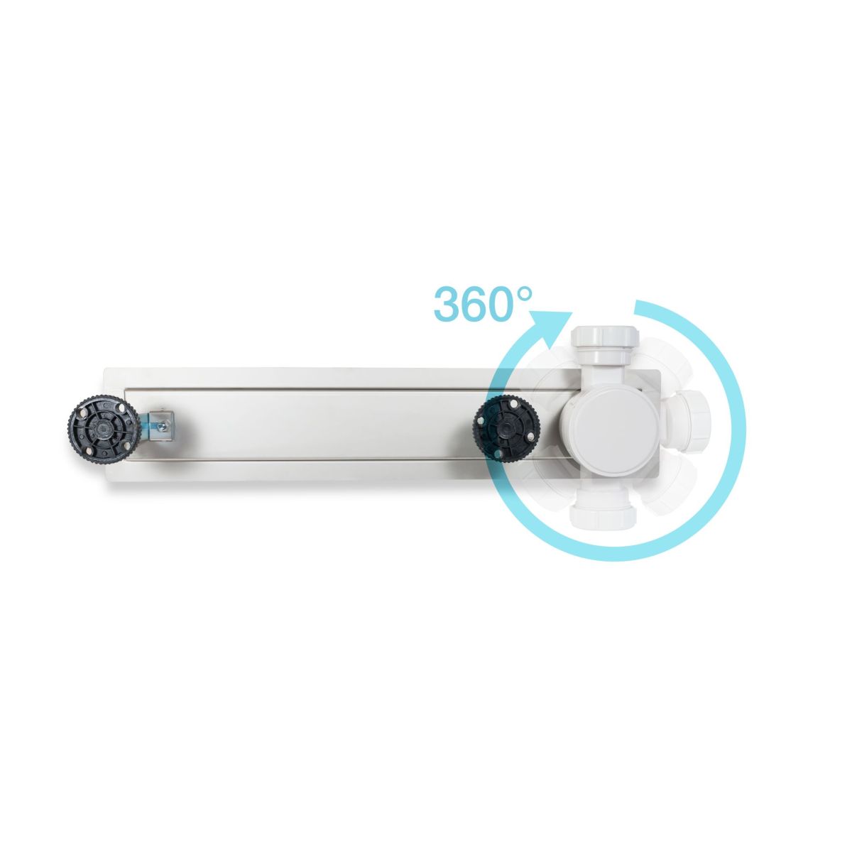 Il SIDE-Drain facilita l'installazione in situazioni in cui il collegamento di un classico scarico lineare è difficile a causa della collisione di più installazioni. Ciò è reso possibile dall'insolito posizionamento della piletta non al centro, ma lateralmente, e dalla sua mobilità a 360 gradi.