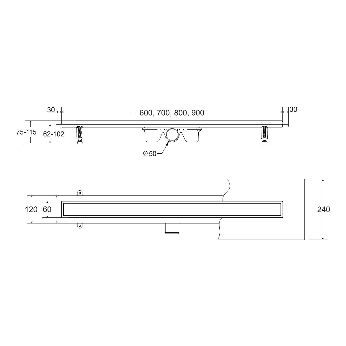 - include: canaletta con sifone e piedini di montaggio, griglia e tappetino di tenuta