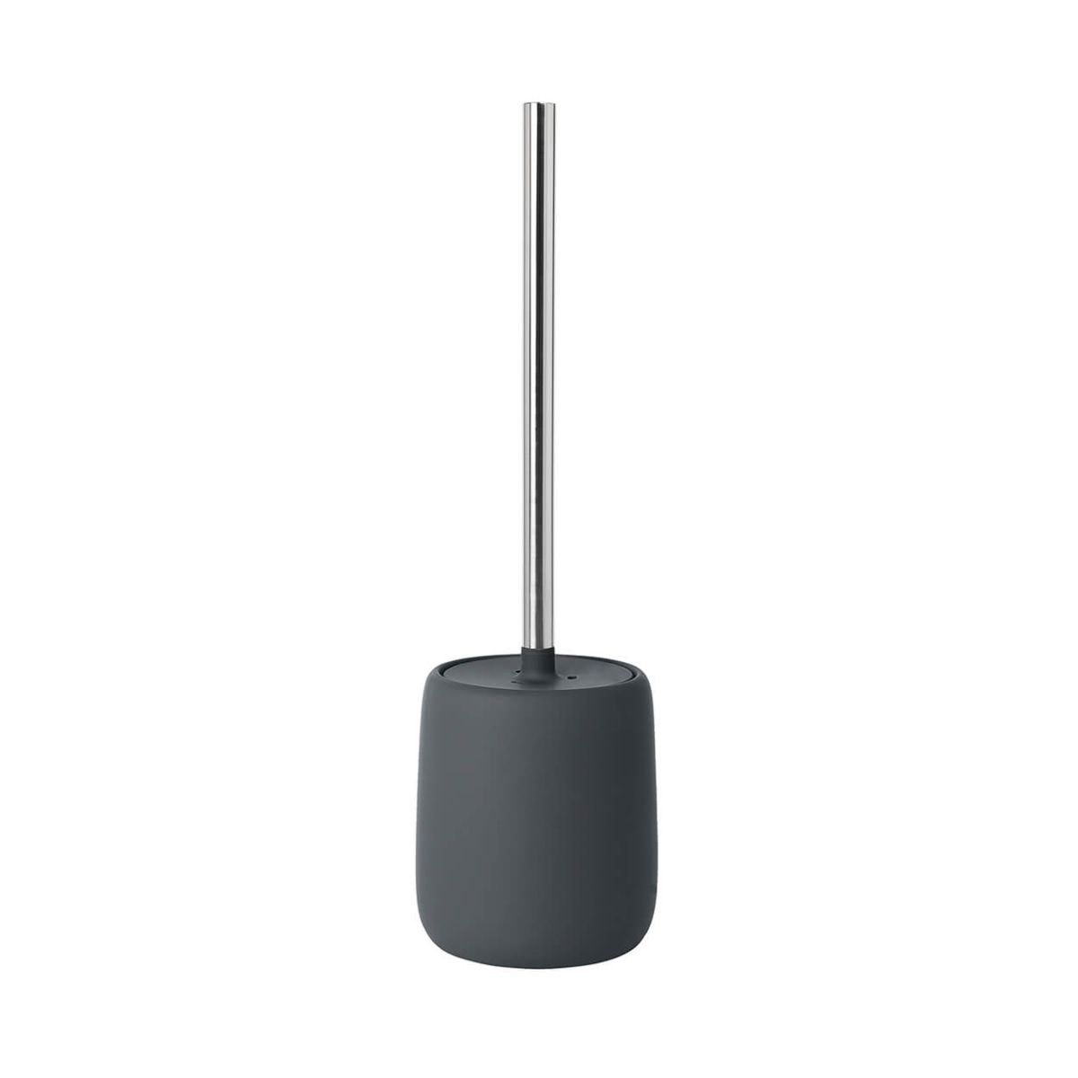 Spazzola per WC della serie Sono. Il contenitore è realizzato in ceramica, con interno smaltato e finitura satinata opaca all'esterno, e il manico è dotato di un coperchio in silicone.