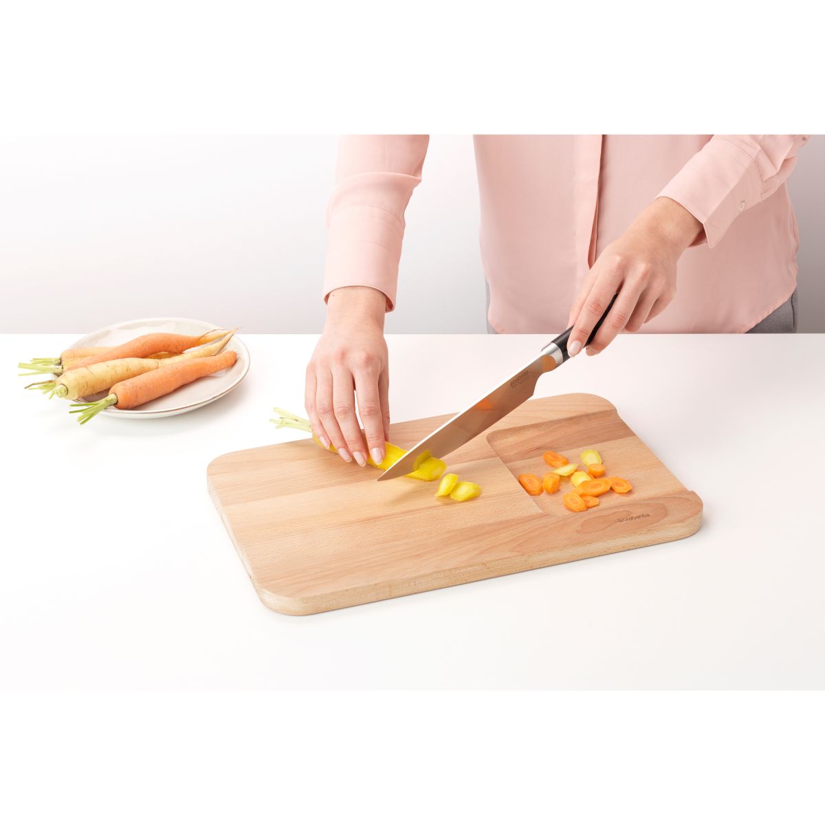 Con l'asse di legno ecologico Profile di Brabantia, tagliare e sminuzzare verdure, erbe e frutta diventerà un'esperienza completamente nuova. Si taglia sulla parte superiore e i prodotti cadono sul fondo. Poiché questa parte è più stretta, non sarà difficile trasferirli in padella. Tutto tagliato? Usate la parte posteriore della tavola per servire il cibo. Il meglio del taglio!