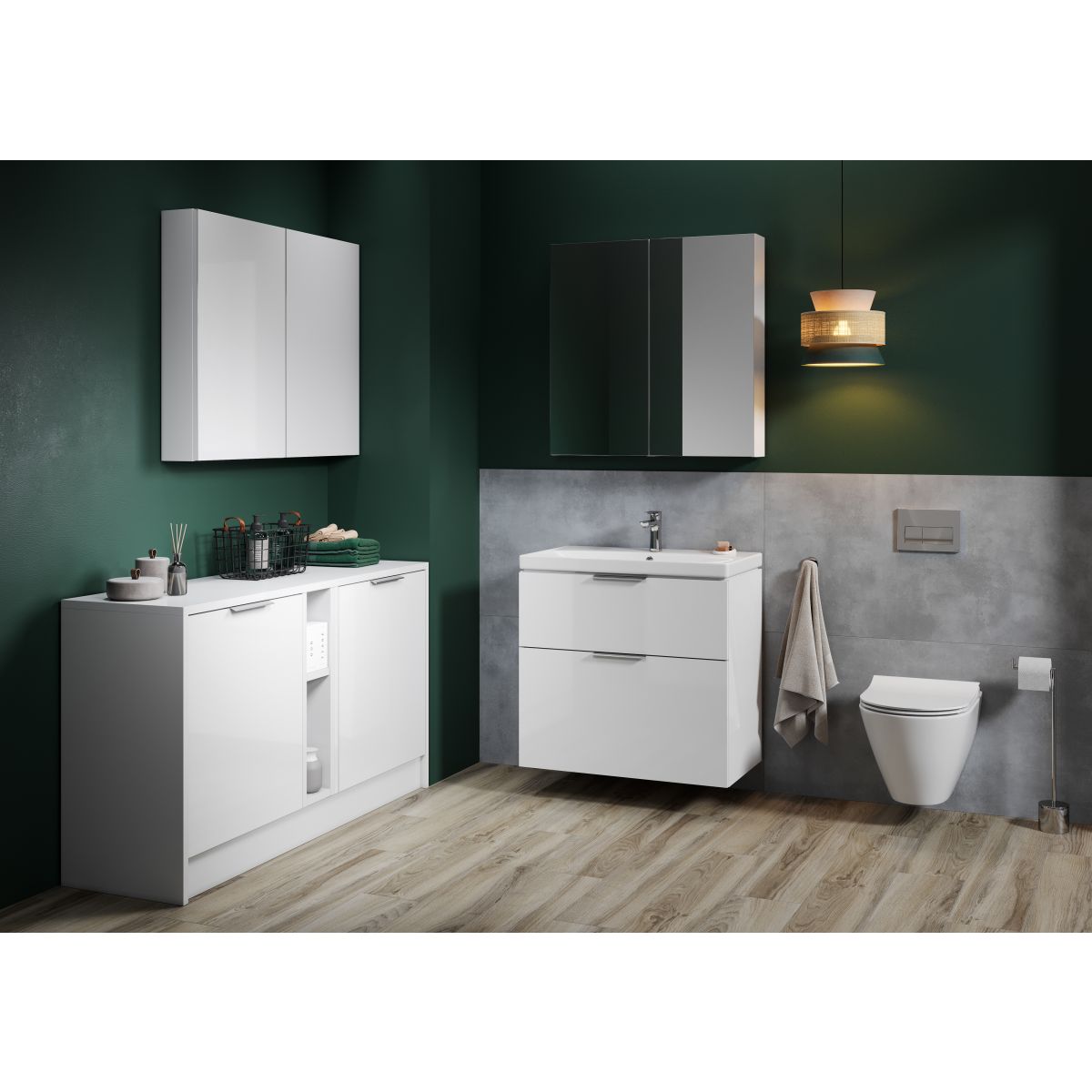Un piano di lavoro da configurare con un mobile sottopiano, sul quale si può montare un lavabo o collocare gingilli e cosmetici a portata di mano. Il piano di lavoro è realizzato in MDF laccato bianco.