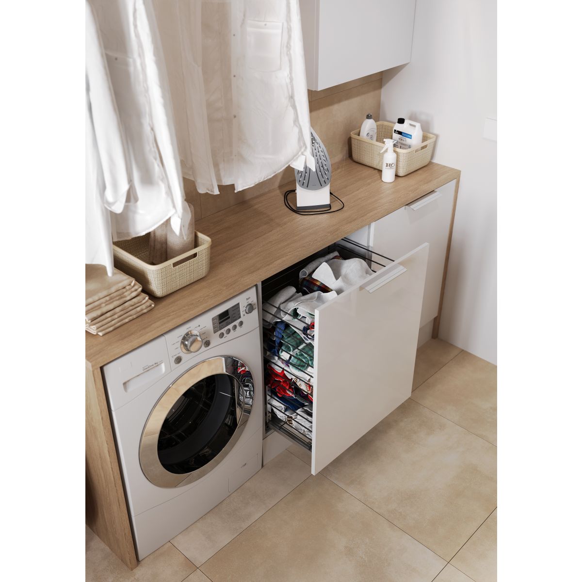 Un piano di lavoro da configurare con un mobile sottopiano, sul quale si può montare un lavabo o collocare oggetti e cosmetici a portata di mano. Il piano di lavoro è realizzato in truciolato laminato in rovere.