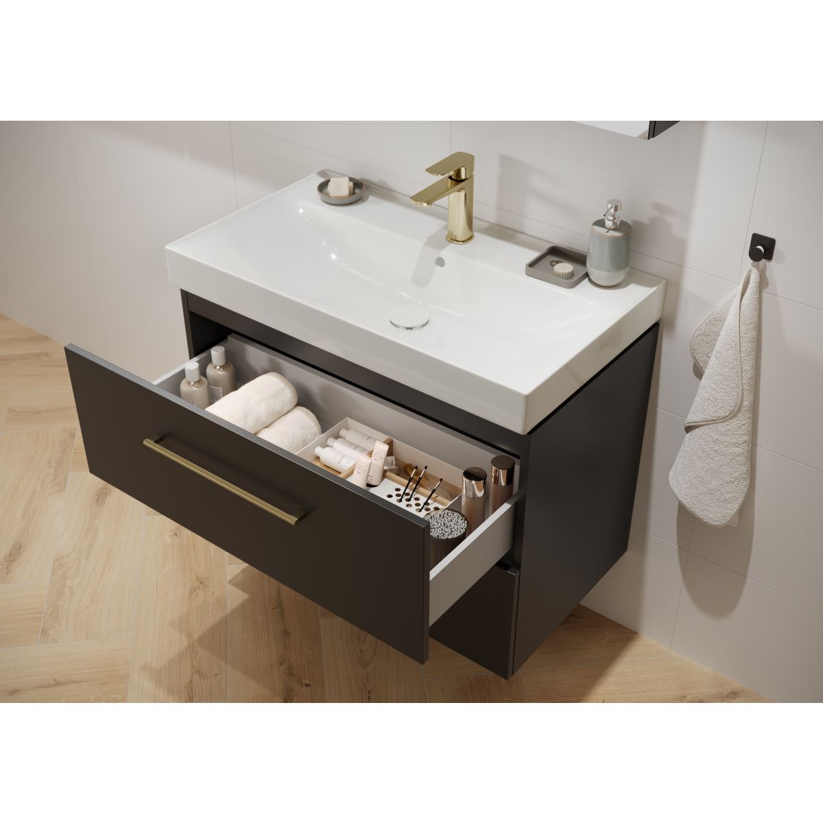 Mobile da bagno della collezione Larga in antracite nella misura 60. Il frontale e il corpo sono realizzati in truciolato, laccato in un elegante colore antracite. Il mobile è dotato di due capienti cassetti che offrono ampio spazio per riporre cosmetici, asciugamani e accessori da bagno. Il loro interno è rifinito in un elegante colore grigio, che si armonizza con il frontale antracite, creando un insieme esteticamente coerente. Il sistema soft close fa sì che i cassetti si chiudano in modo delicato e silenzioso, aumentando il comfort di utilizzo. Un elemento caratteristico del mobile è la maniglia fresata, che ne sottolinea lo stile minimalista. Questa maniglia è disponibile in tre colori - argento, oro e nero - dandovi la possibilità di personalizzare il mobile e di abbinarlo ad altri elementi dell'arredo bagno. La maniglia deve essere acquistata separatamente. Il pannello con cui è realizzato il mobile è certificato FSC MIX CREDIT SGSCH-COC-007574.