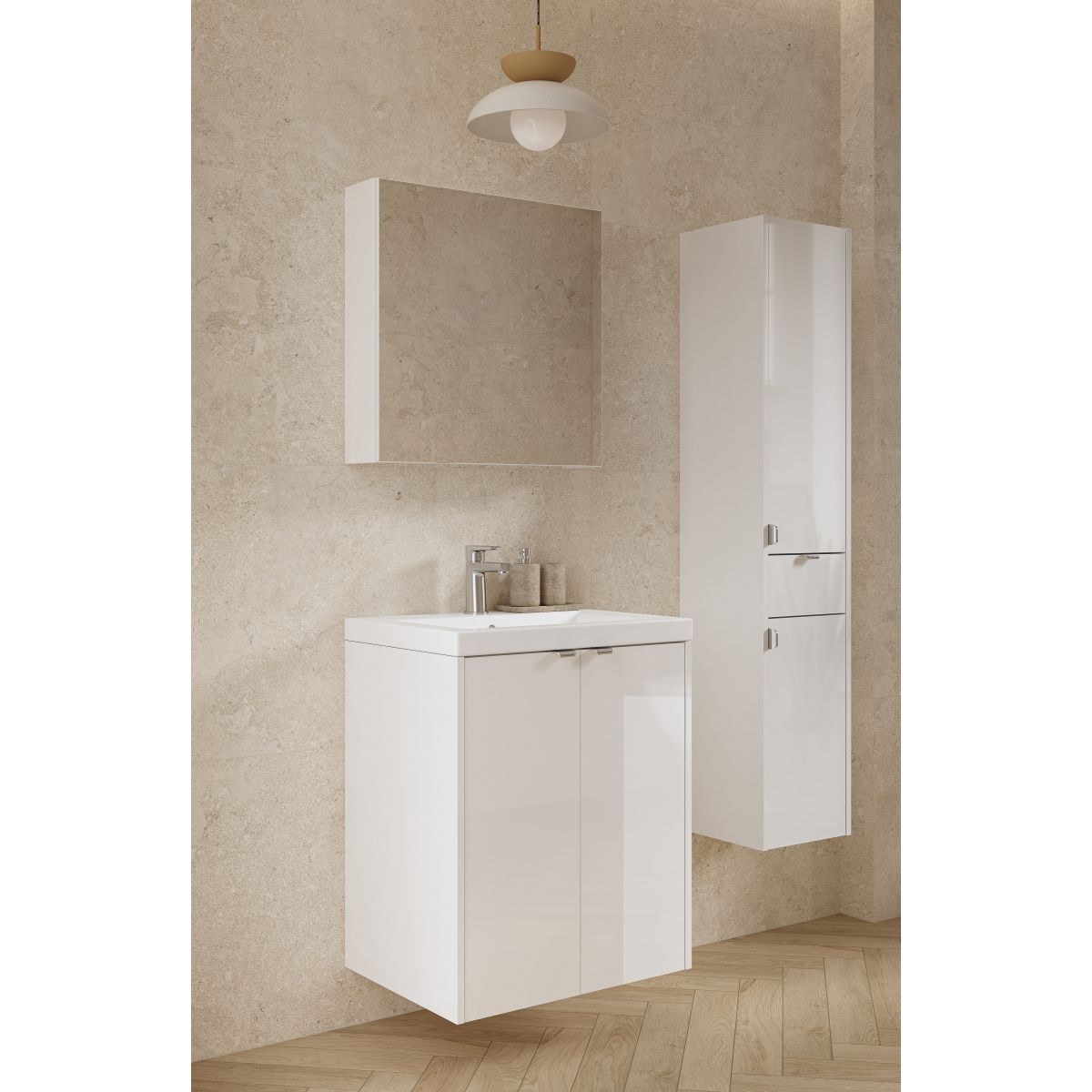 - Il set OVIDA 50 in bianco (mobile sottolavabo + lavabo in ceramica) è una soluzione versatile ed elegante per il bagno. La tonalità chiara e intramontabile dona freschezza e leggerezza all’ambiente, integrandosi perfettamente sia negli arredi moderni che in quelli classici. Il mobile è dotato di due ante e un ripiano interno, che offrono uno spazio comodo per riporre cosmetici, prodotti per la cura personale e accessori da bagno.
