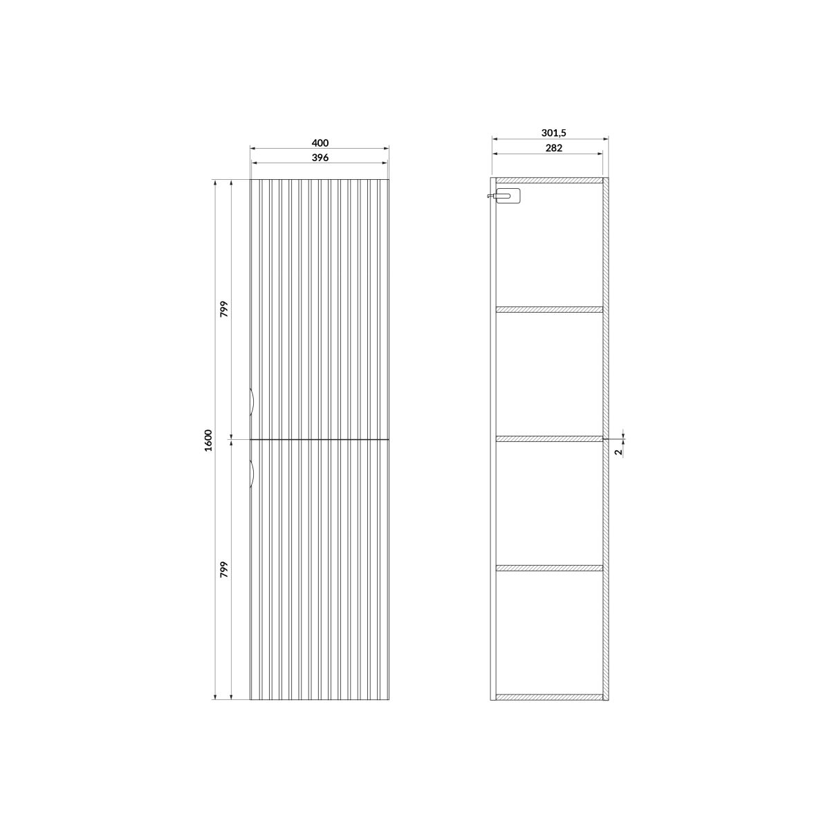- frontale: scanalato, pannello MDF laminato opaco