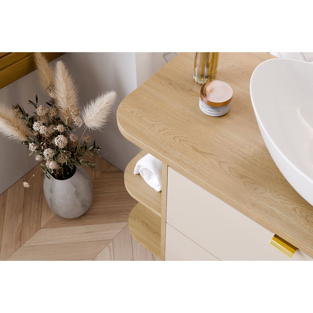 Il mobile aperto sotto il piano di lavoro, largo 20 cm, è un tocco delicato che introduce calore naturale e ordine negli interni minimalisti. La sua forma arrotondata e angolare chiude armoniosamente la composizione, aggiungendo morbidezza ed eleganza all'arredamento. Il mobile è stato accuratamente rifinito con il decoro Rovere Cremona, che riproduce fedelmente la bellezza del legno naturale e crea un'atmosfera accogliente. La struttura in resistente pannello laminato garantisce solidità e lunga durata. Grazie alla piena compatibilità con la collezione Dalia Cashmere, potete creare liberamente lo spazio, aggiungendo un carattere distintivo e uno stile coerente.