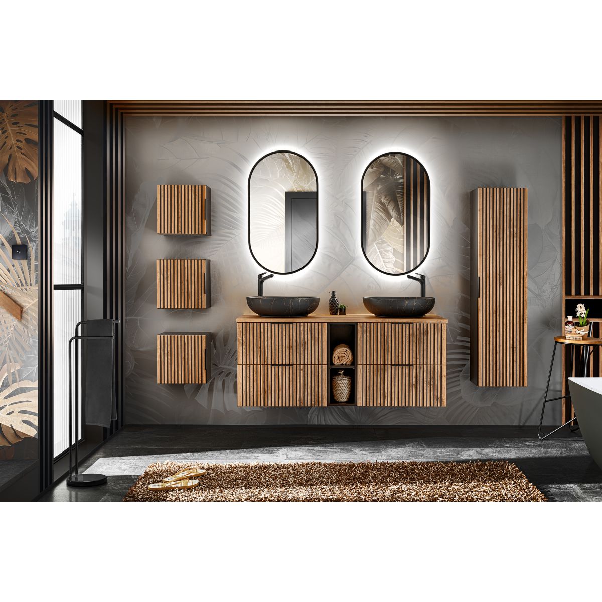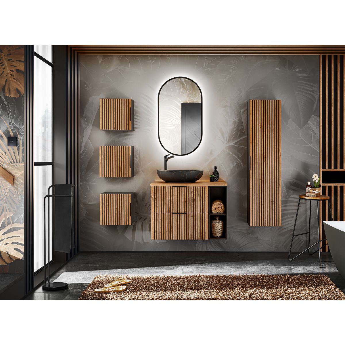 È una collezione che delizia per il colore e lo stile, la venatura espressiva del Rovere Wotan abbinata alla scanalatura nera, è una novità sul mercato dei mobili che sta diventando sempre più popolare. La collezione comprende armadietti sottolavabo di varie dimensioni, un montante alto, contenitori e un ripiano inferiore, rendendo la collezione modulare, che dà la possibilità di creare set adatti a bagni di qualsiasi dimensione. La collezione Xilo non è solo qualità e design moderno, ma anche comfort e funzionalità . Per i mobili lavabo, è possibile utilizzare lavabi d'arredo o combinarli con piani d'appoggio e scegliere un lavabo regolabile dall'ampia offerta Comad.