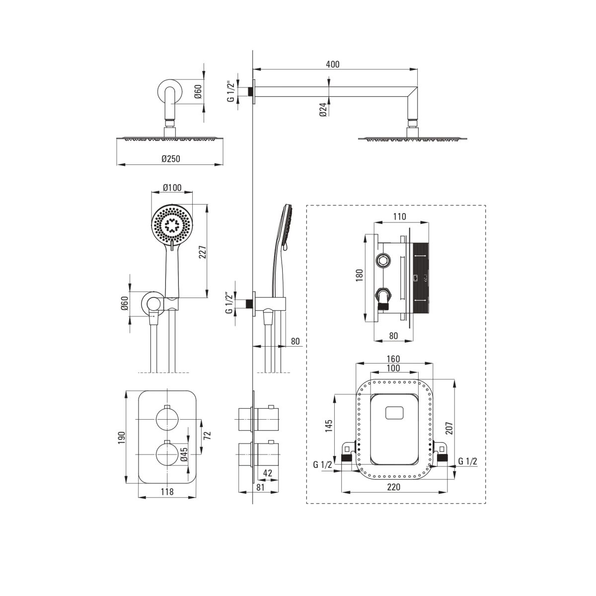 Comprende: rubinetto con deviatore, soffione doccia, doccetta, flessibile doccia, braccio per soffione, prese d'acqua