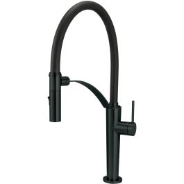 Il miscelatore da cucina Corda è un'aggiunta elegante a qualsiasi cucina moderna. Il beccuccio flessibile permette di maneggiarlo liberamente quando si lavano le stoviglie o si riempiono d'acqua recipienti alti. Grazie alla maniglia magnetica, l'erogatore torna rapidamente ed efficacemente al suo posto. La manopola a doppia funzione offre la possibilità di passare al getto a pioggia, ideale per sciacquare verdura e frutta. La finitura nero opaco si abbina perfettamente ai lavelli in granito scuro ed è facile da mantenere pulita. Il design del rubinetto si sposa perfettamente con la serie di lavelli in granito Corda, creando un insieme coeso ed elegante in una cucina moderna.