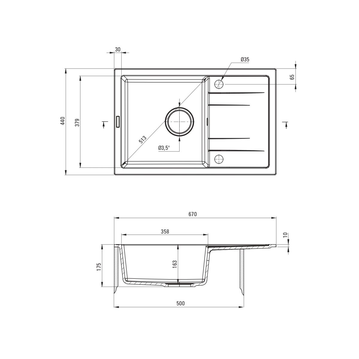 - taglio nel piano di lavoro (incassato) - lunghezza: 65 cm