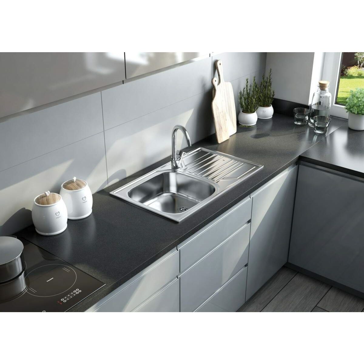Il lavello Doppio ha una vasca e un ampio sgocciolatoio decorativo. È realizzato in acciaio, caratterizzato da proprietà antisettiche naturali. La finitura satinata è liscia al tatto e aggiunge un tocco chic ed elegante alla cucina. È incluso un tappo manuale con finitura cromata.