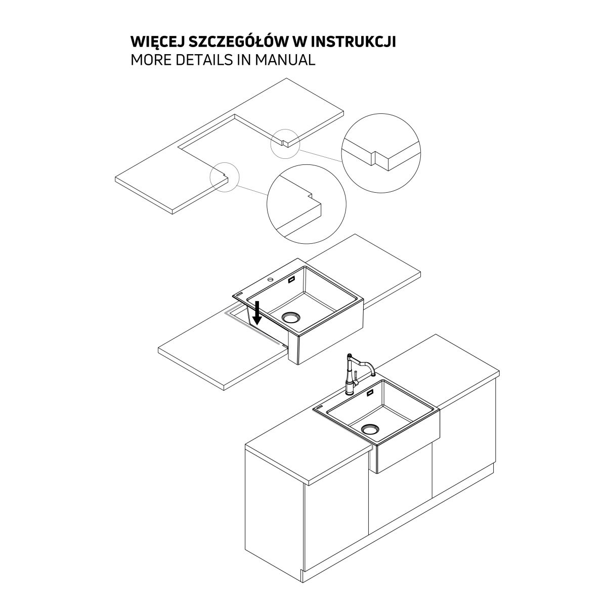 - NOTA: Metodo di installazione speciale - modulare, stand-up. Vedere le istruzioni per i dettagli. Preparare l'apertura sopra il mobile in base alle dimensioni del lavello. Ideale sopra un mobile da 60 cm.