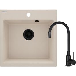 Il lavello in granito chiaro abbinato al miscelatore nero e alla rubinetteria nera è una combinazione di grande design. Il lavello è dotato di una vasca profonda che consente di lavare piatti di grandi dimensioni, mentre le modanature supplementari consentono l'installazione opzionale di un distributore di detersivo per piatti. Realizzato in granito di alta qualità , il lavello presenta un'impareggiabile resistenza agli urti, al calore, allo scolorimento e agli shock termici, garantendo una durata e un utilizzo senza problemi per anni. La norma europea PN-EN 13310, a cui è conforme, testimonia i più elevati standard di qualità e sicurezza. Il lavello è completo di un miscelatore con bocca curva. Grazie al suo particolare design, questo miscelatore non solo facilita il riempimento di pentole alte con acqua, ma offre anche una maggiore libertà di movimento durante i lavori in cucina. Acquistando questo set, si punta sulla funzionalità e su un design interessante.