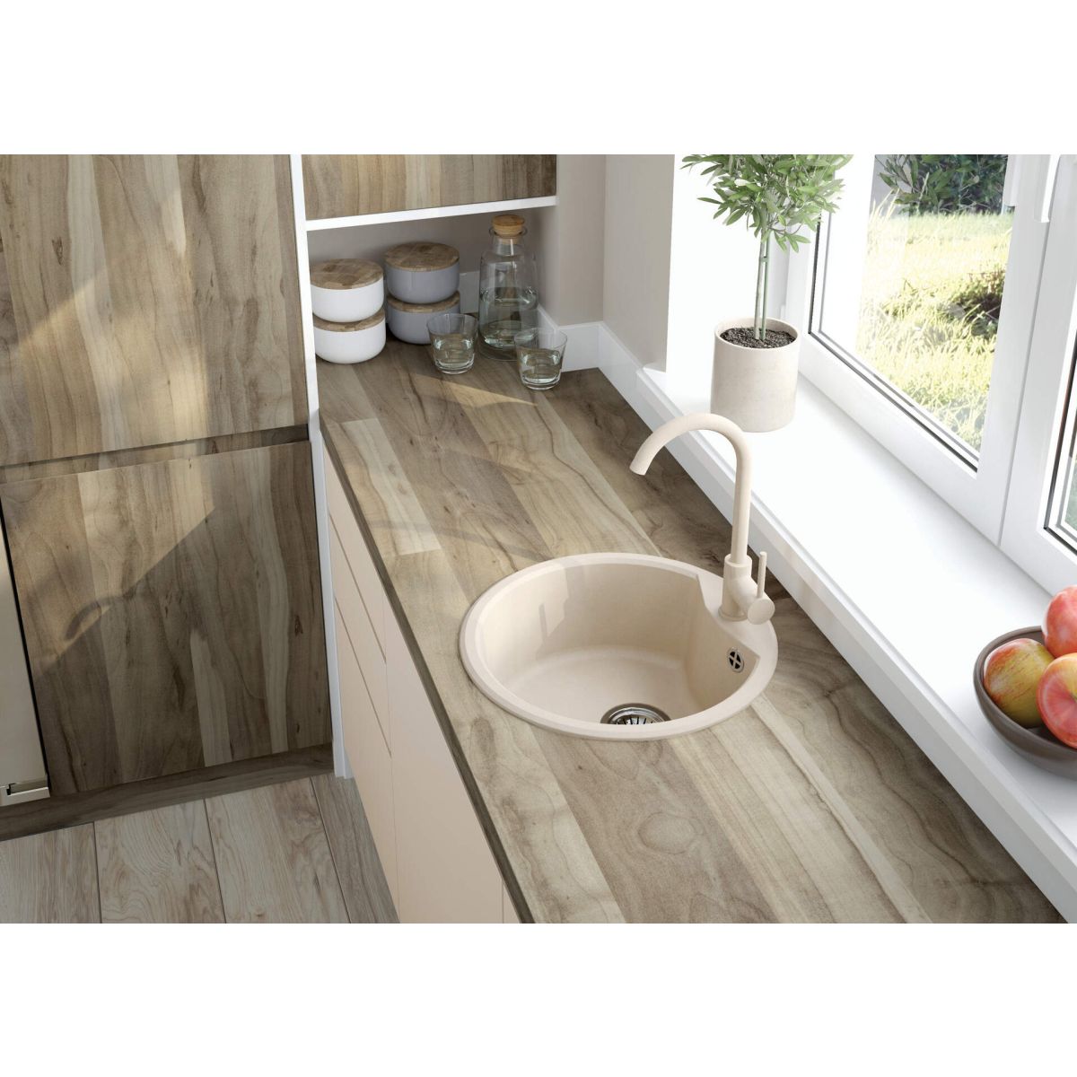 Il miscelatore per lavello Nemesia con bocca a "U", in finitura beige chiaro, leggermente maculato e finto granito, è una scelta eccellente per le cucine moderne. Il suo colore universale e luminoso lo rende una proposta a tutto tondo, in grado di abbinarsi a soluzioni minimaliste, classiche e rustiche. Il miscelatore Nemesia presentato è caratterizzato da una bocca alta e arrotondata a "U", da una comoda leva posizionata sul lato del miscelatore e da un aeratore che ne favorisce il flusso. Il miscelatore per lavello della collezione Nemesia, che comprende tre tipi di miscelatori per cucina, dà il meglio di sé se abbinato a un lavello in granito chiaro e a un piano di lavoro chiaro o in legno, ma la tonalità beige, senza tempo, si armonizza con molti ambienti della cucina.