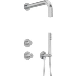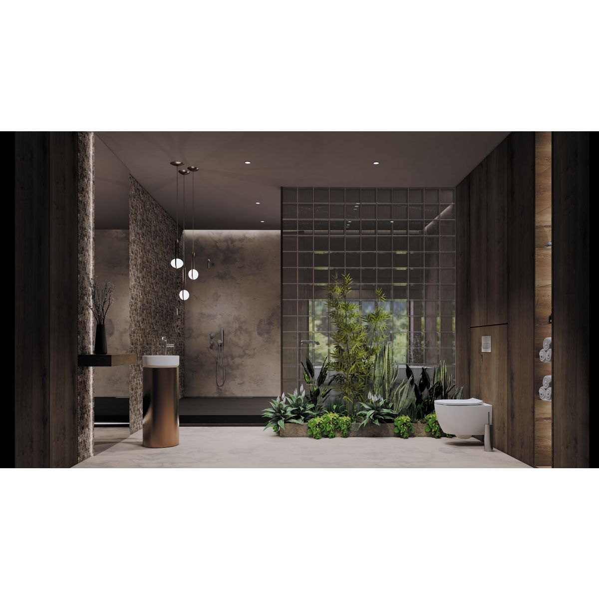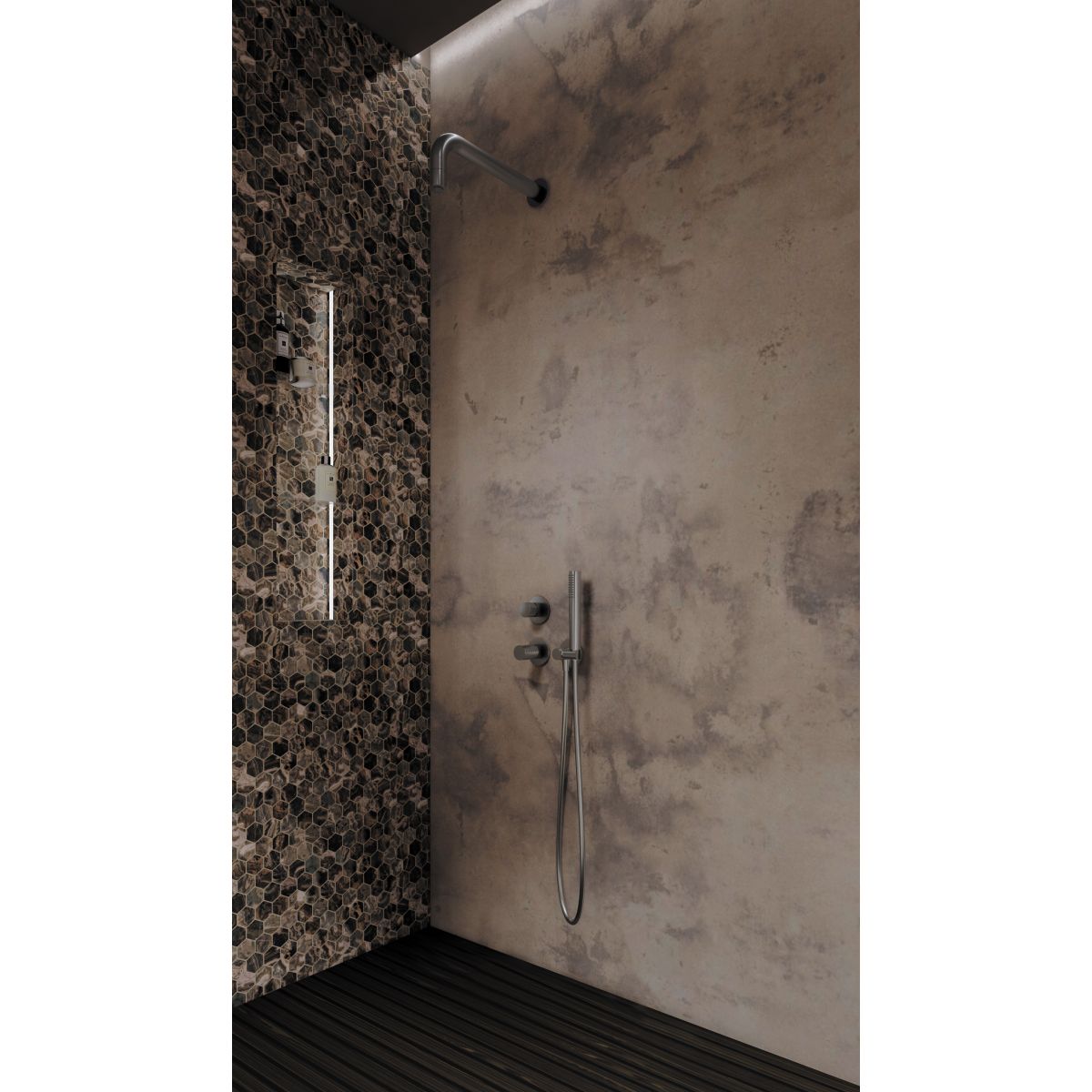 Il set da incasso Silia Hexa è una combinazione armoniosa di tecnologia moderna e design esclusivo. Appartiene alla serie anniversario Hexa, in edizione limitata, e fa parte della collezione top di gamma Silia. La sua caratteristica distintiva è una leva gioiello con una struttura geometrica fresata con precisione che riflette sottilmente la luce, sottolineando il carattere unico del miscelatore. Il set è composto da una bocca di erogazione a parete con soffione, un miscelatore da incasso, un flessibile, una cornetta per doccia e un raccordo angolare. Il miscelatore è dotato di un interruttore di funzione meccanico in ceramica, che garantisce un cambio fluido e preciso della sorgente d'acqua. Il soffione in ottone è dotato di un sistema Anti-Calc, che riduce efficacemente la formazione di calcare e ne facilita la pulizia. Il tubo doccia è dotato di tecnologia Anti-Twist per evitare torsioni durante l'uso. La manopola della doccia, realizzata in acciaio inox di alta qualità, offre un piacevole getto a pioggia per un bagno rilassante. Un'ulteriore caratteristica è l'attacco angolare mobile, che consente di regolare la posizione della cornetta per un maggiore comfort. Il design complessivo è rifinito in elegante acciaio spazzolato, che esalta il carattere minimalista e moderno del bagno, conferendogli un aspetto elegante e sofisticato.