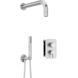 Il set doccia della collezione Silia è un esempio di perfetta combinazione tra moderne soluzioni tecnologiche e design minimalista. Il set è composto da una bocca di erogazione con un piccolo soffione, un miscelatore a incasso e una manopola doccia con tubo flessibile e maniglia a punta. Il soffione crea un flusso d'acqua ottimale e conico per una doccia confortevole. Il miscelatore a scomparsa, dotato di un facile interruttore a levetta, consente di commutare efficacemente il flusso d'acqua tra la manopola e l'erogatore. Inoltre, la manopola della doccia dotata di sistema cool-out non si riscalda, aumentando la sicurezza e il comfort, e il tubo flessibile della doccia con sistema antitorsione impedisce l'attorcigliamento, aumentando la praticità. L'installazione a scomparsa garantisce un aspetto estetico gradevole e facilita la pulizia. Il design complessivo è rifinito in acciaio spazzolato e si adatta perfettamente agli interni dei bagni moderni, combinando eleganza e funzionalità.
