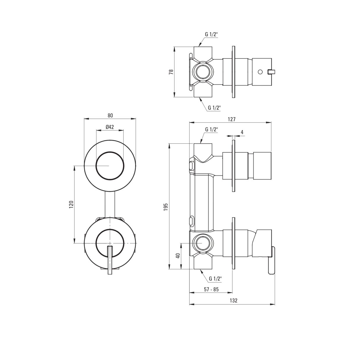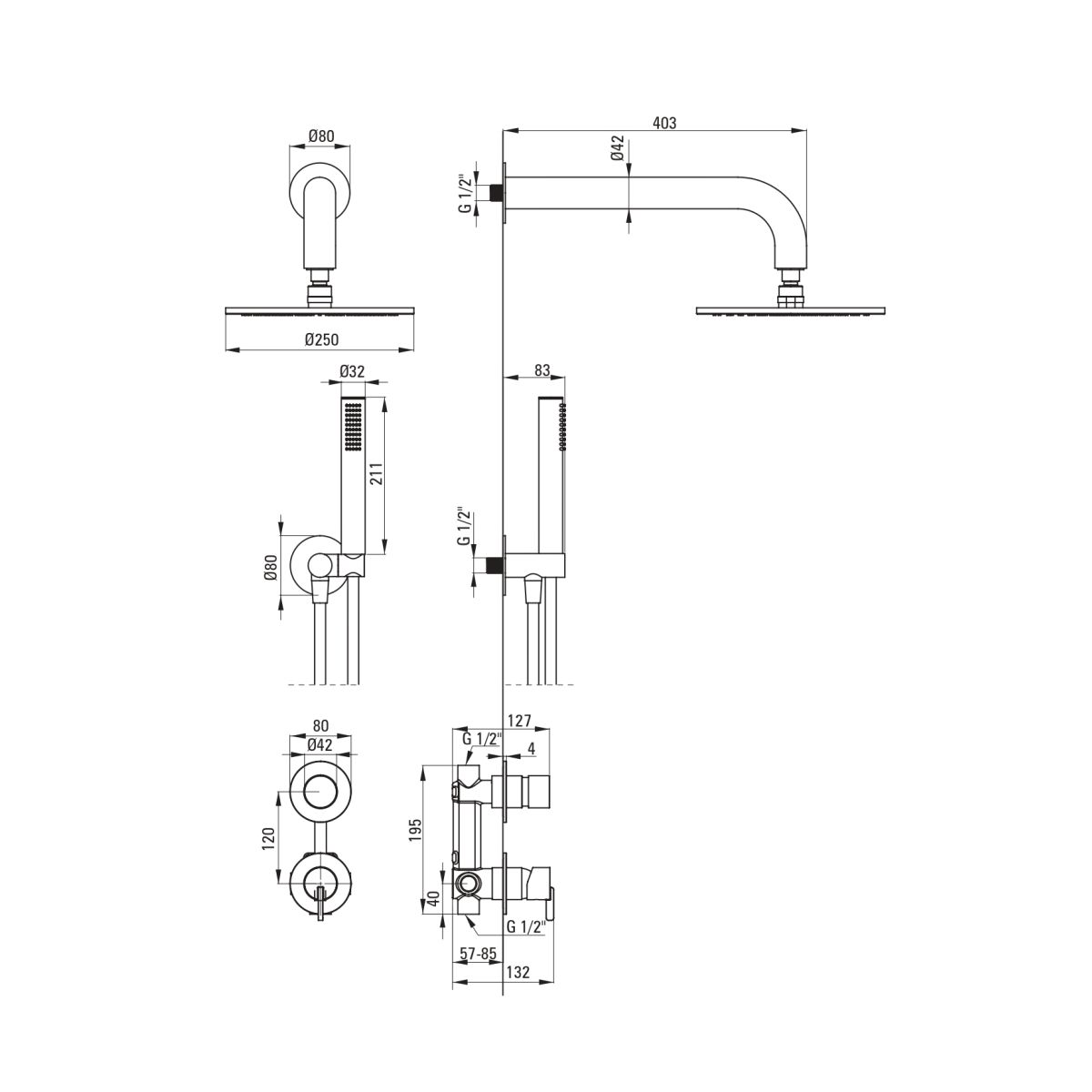 - Comprende: rubinetto con deviatore, soffione doccia, doccetta, flessibile doccia, braccio per soffione, prese d'acqua