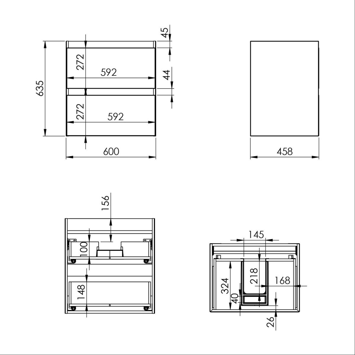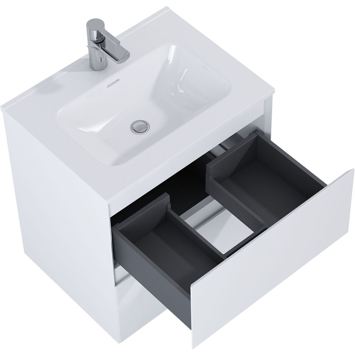 Mobile lavabo Split da 60 cm, 2 cassetti con sponde in metallo, ad estrazione totale e con chiusura ammortizzata. Il mobile è realizzato con materiali di alta qualità, il frontale e il corpo sono in pannello laminato, laccato in bianco opaco.
