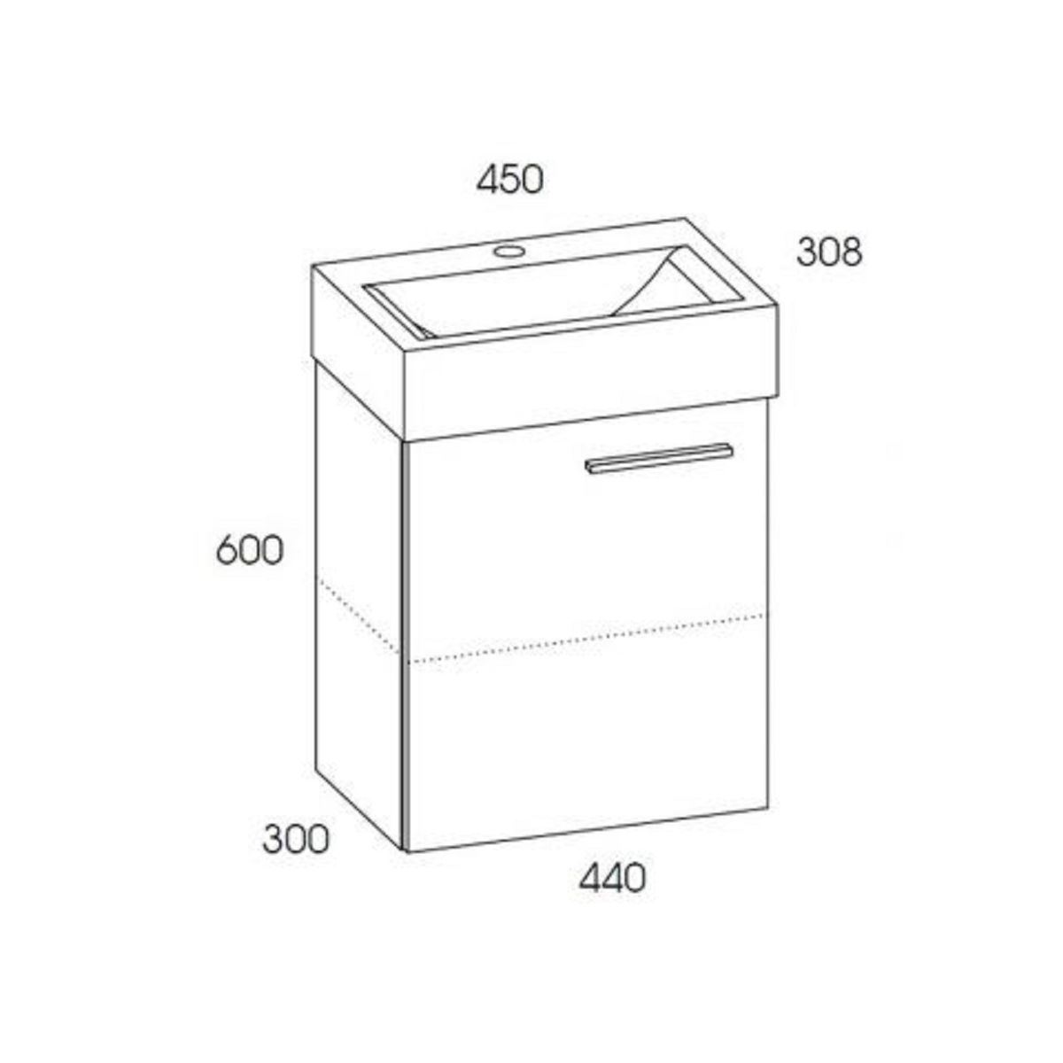 Set Tiny 45 cm, 1 anta, dotato di 1 ripiano regolabile in altezza. Realizzato in materiali resistenti all'umidità, frontale e corpo in cartone laminato, ferramenta con chiusura ammortizzata. Maniglie in metallo in nero opaco. Il set è composto da un mobile lavabo in rovere canela e da un lavabo in nero.