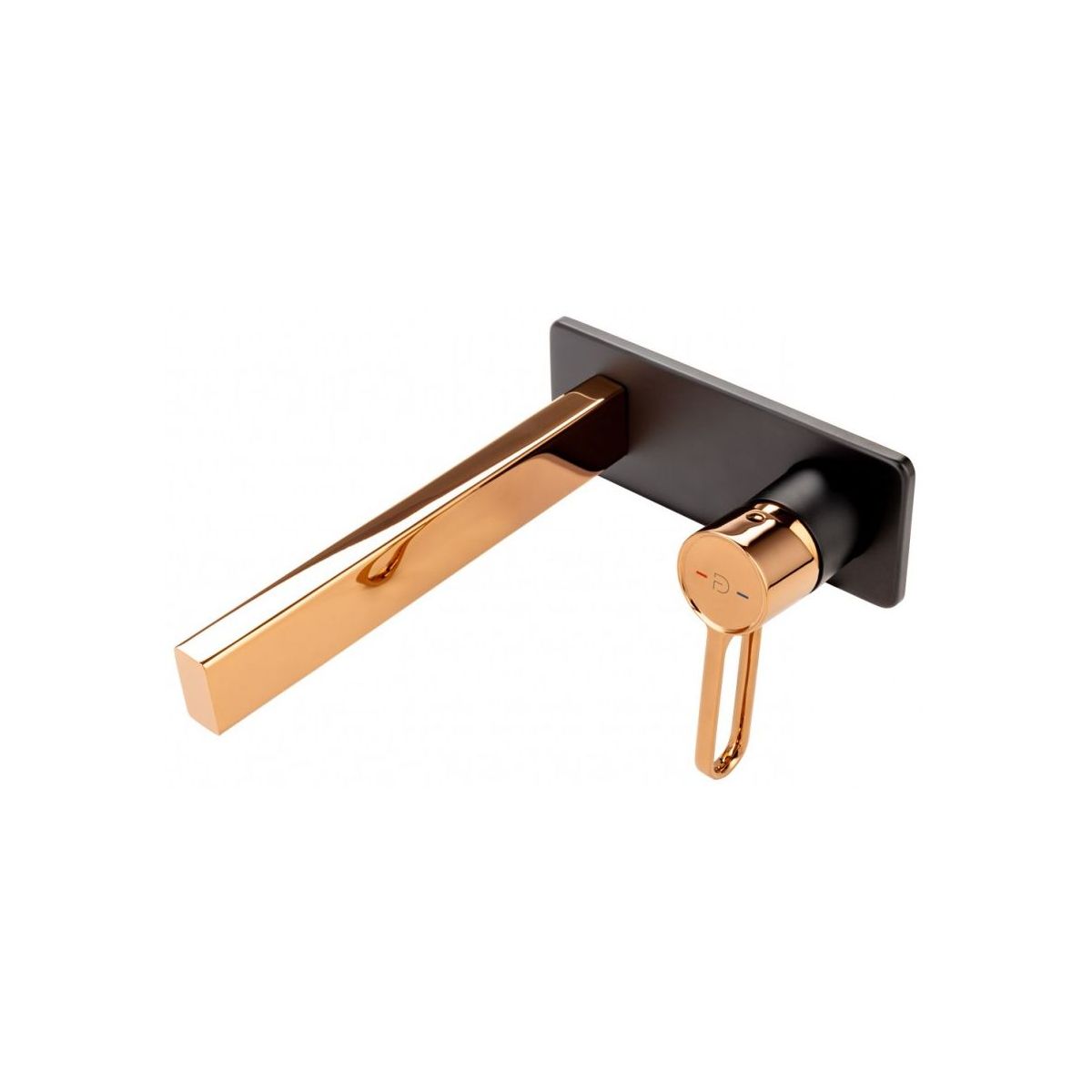 Il miscelatore lavabo da incasso Zaffiro soddisferà le aspettative degli utenti più esigenti. È dotato di meccanismo da incasso e componenti a vista. Funzionale, ha un beccuccio con portata ottimale, un'ergonomica maniglia aperta che garantisce comodità d'uso ed è facile da pulire. Il design semplice e minimalista, basato sul contrasto tra rettangolo e ovale, richiama la tendenza industriale ancora attuale nell'arredamento d'interni. La finitura in nero e oro rosa conferisce al rubinetto un'eleganza chic.