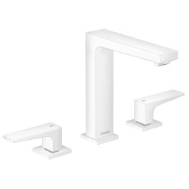 il miscelatore per lavabo Metropol 160 a 3 fori con maniglie monocomando e scarico Push-Open in bianco opaco di hansgrohe fa bella mostra di sé sul lavabo. Questo elegante miscelatore con funzionamento classico a due maniglie affascina con il suo design geometrico e la pregiata finitura bianca opaca gli conferisce un carattere particolarmente intrigante. Le ampie superfici e le forme precise fanno di questo miscelatore un manifesto del design moderno. Il deciso bianco opaco del miscelatore per lavabo si sposa particolarmente bene con un bagno moderno. Ulteriore vantaggio: l'ampia distanza tra la bocca di erogazione e il lavabo lascia più spazio per un utilizzo confortevole (ComfortZone 160).
