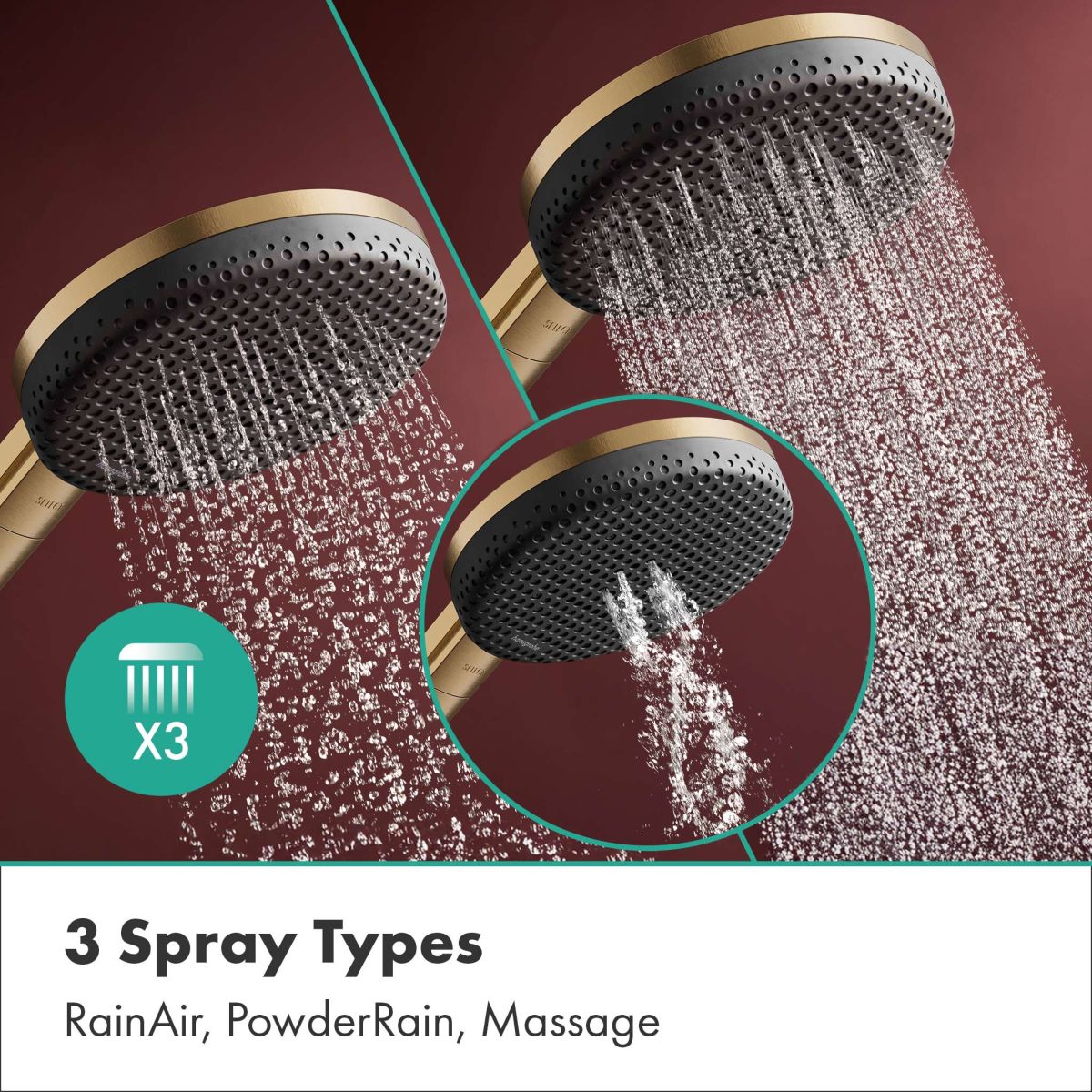 - Ampia scelta: a seconda del vostro umore, potete selezionare uno dei tre tipi di getto del soffione utilizzando il pulsante (Select). Il soffione vi coccola con il getto Rain - a seconda delle vostre preferenze, potete anche impostare hansgrohe PowderRain come opzione alternativa