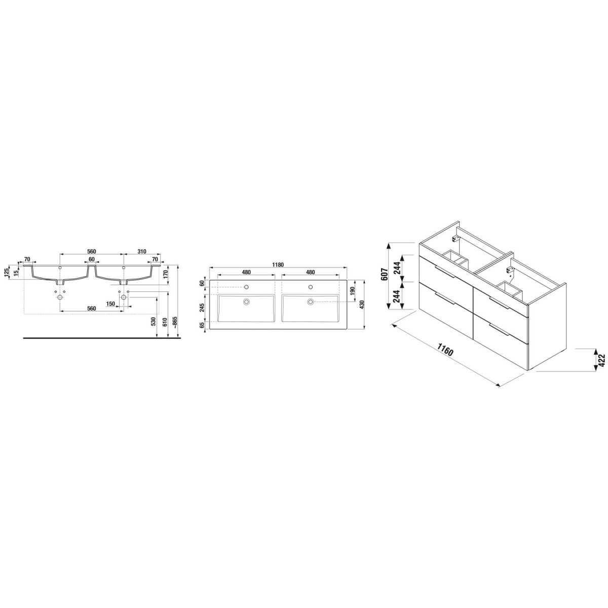 Il mobile lavabo a 4 cassetti con forme geometriche è proposto in un comodo set 1+1 PACK insieme al lavabo doppio Cube da 1200 x 430 mm con vano portaoggetti. Le maniglie sono in un pratico colore nero. I mobili da bagno Cube sono garantiti per 2 anni.