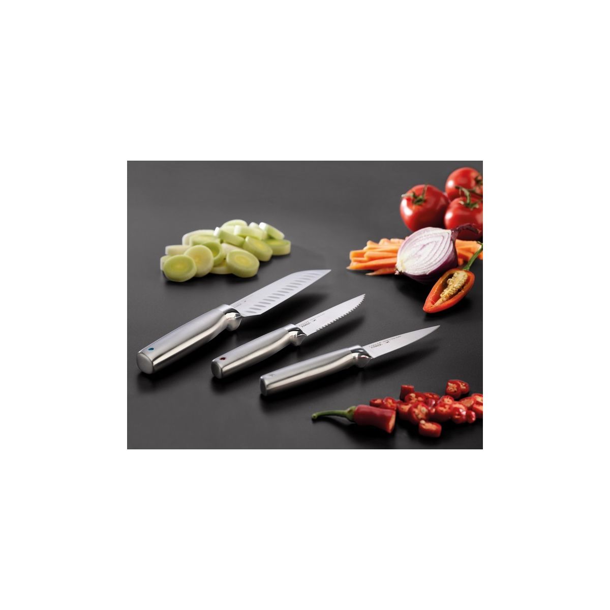 - incluso: coltello da frutta (9 cm), coltello seghettato (11 cm), coltello Santoku (14 cm), coltello da macellaio (16 cm), forbici, blocco in bambù,