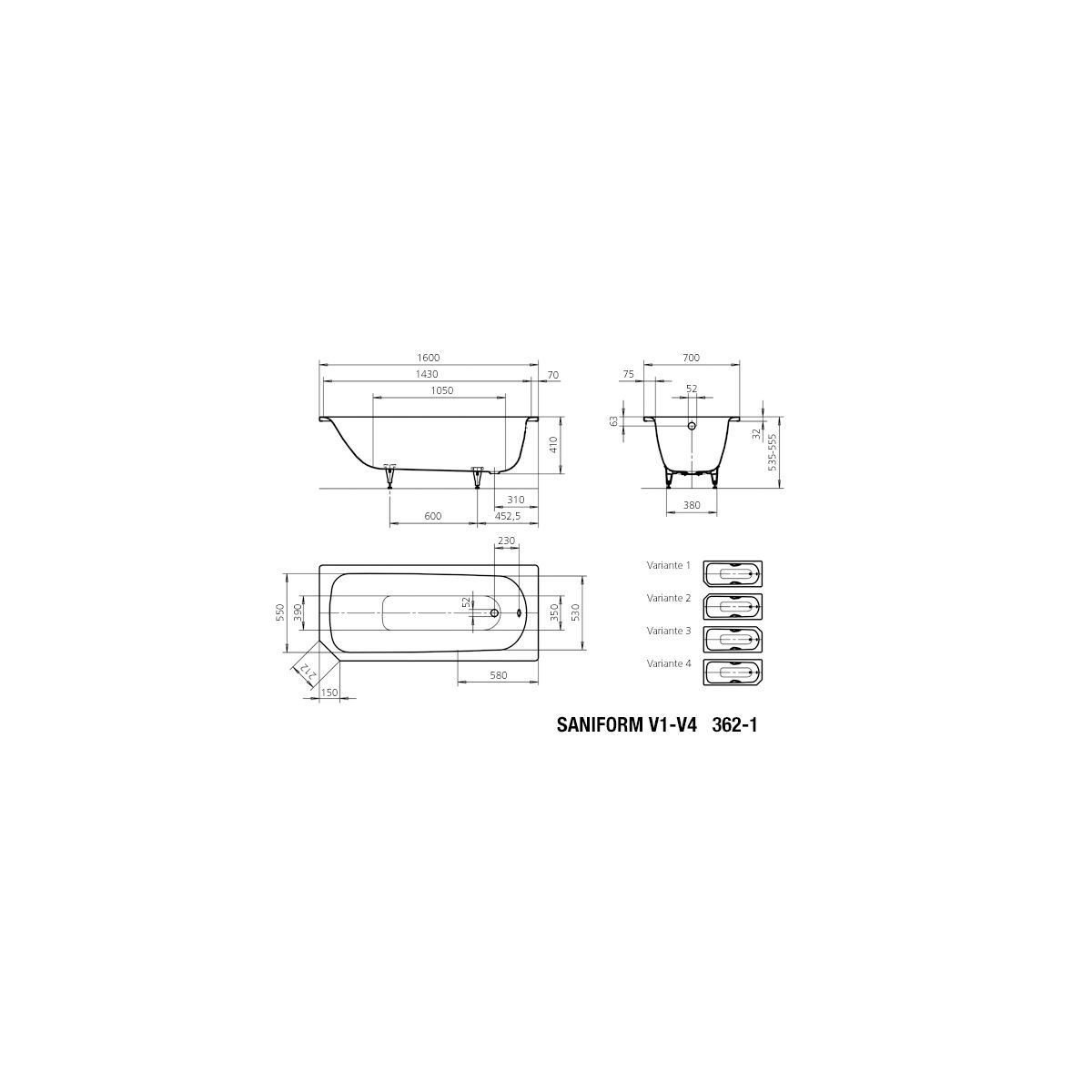 Kaldewei Saniform V1-V4 vasca da bagno rettangolare 160x70 cm bianco 192300010001