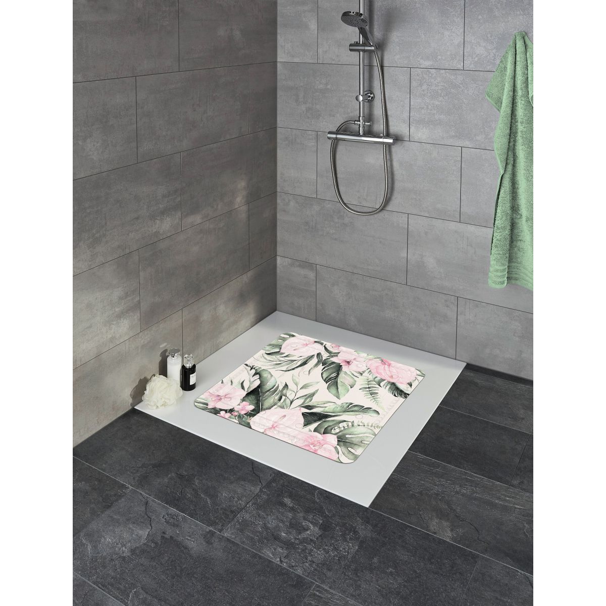 Bellissimo tappetino da bagno con motivo di foglie esotiche e fiori di anthurium - per la doccia. Dimensioni: 55 cm x 55 cm