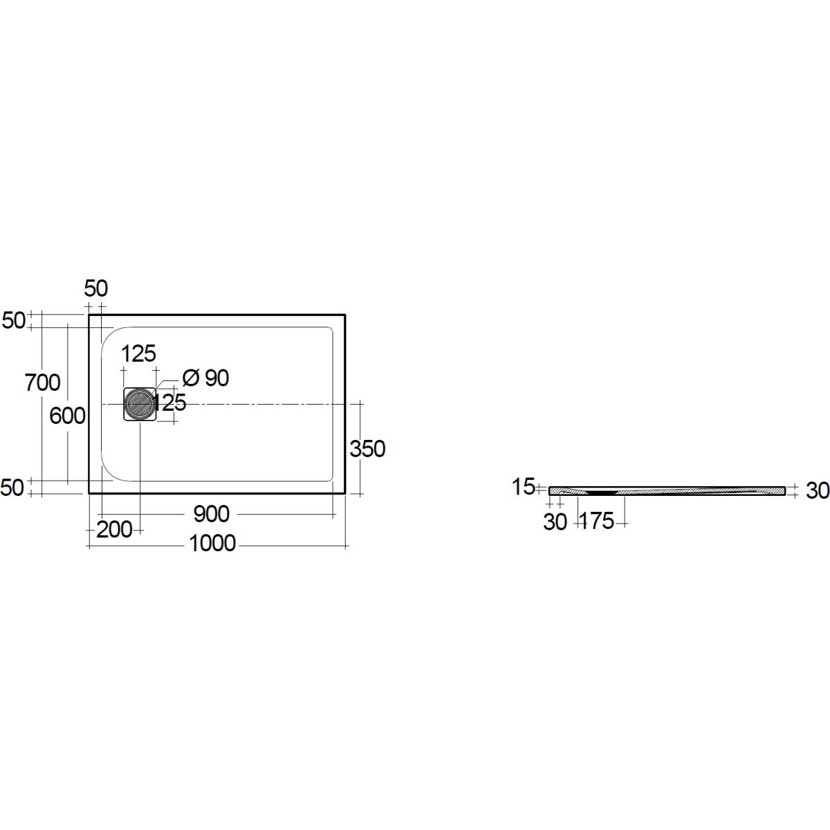 - scarico posizionato centralmente lungo il lato più corto Ø 9 cm
