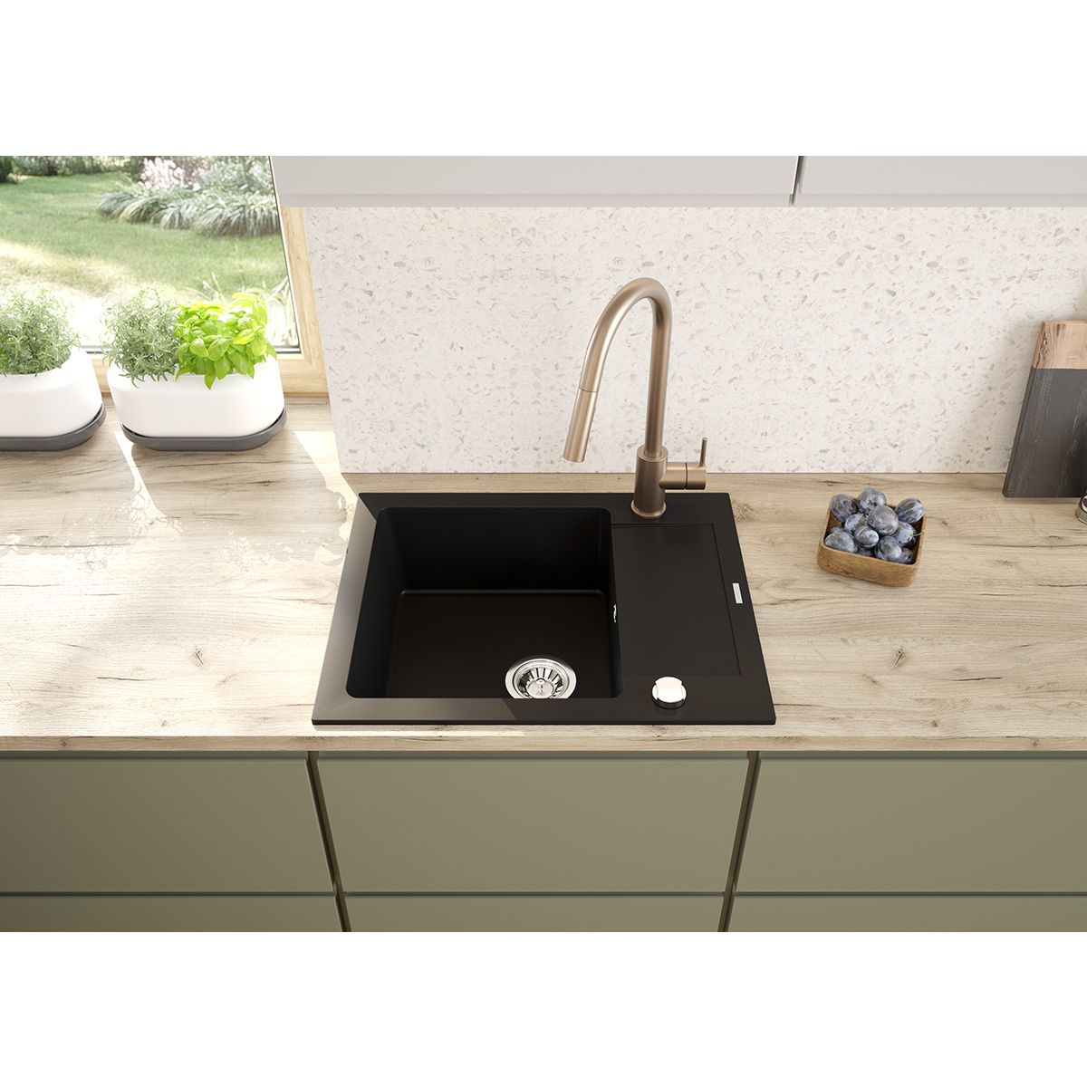 Il lavello in granito della serie Gravan è realizzato in un materiale durevole, resistente alle macchie, ai graffi e al calore (fino a 280 °C). Set di scarico con sifone incluso. Larghezza minima della sottostruttura 45 cm.