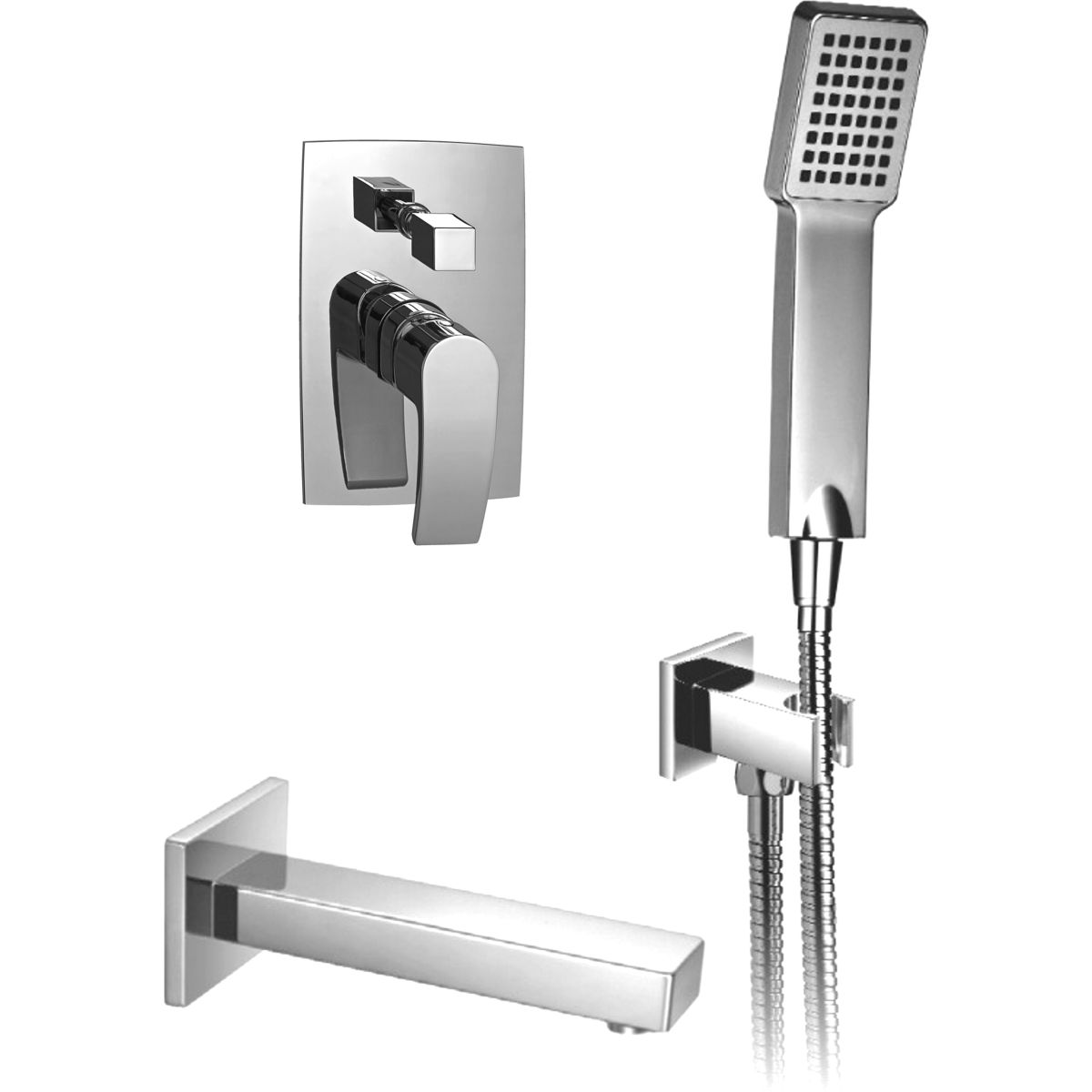 Comprende: rubinetto con deviatore, bocca di erogazione per vasca, doccetta, flessibile doccia, prese d'acqua