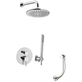 Comprende: rubinetto con deviatore, soffione doccia, doccetta, flessibile doccia, braccio per soffione, prese d'acqua, sistema di riempimento e scarico