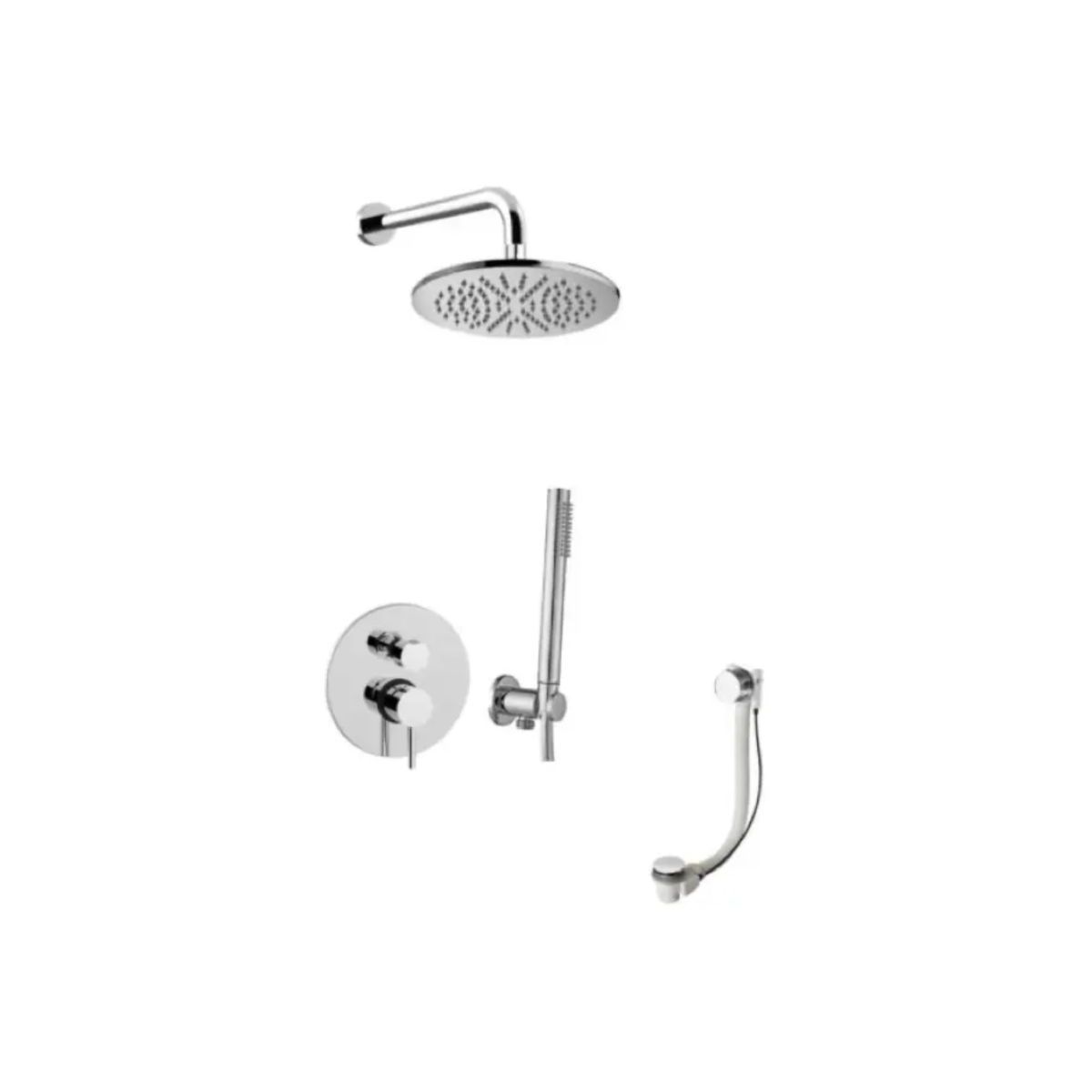 - Comprende: rubinetto con deviatore, soffione doccia, doccetta, flessibile doccia, braccio per soffione, prese d'acqua, sistema di riempimento e scarico