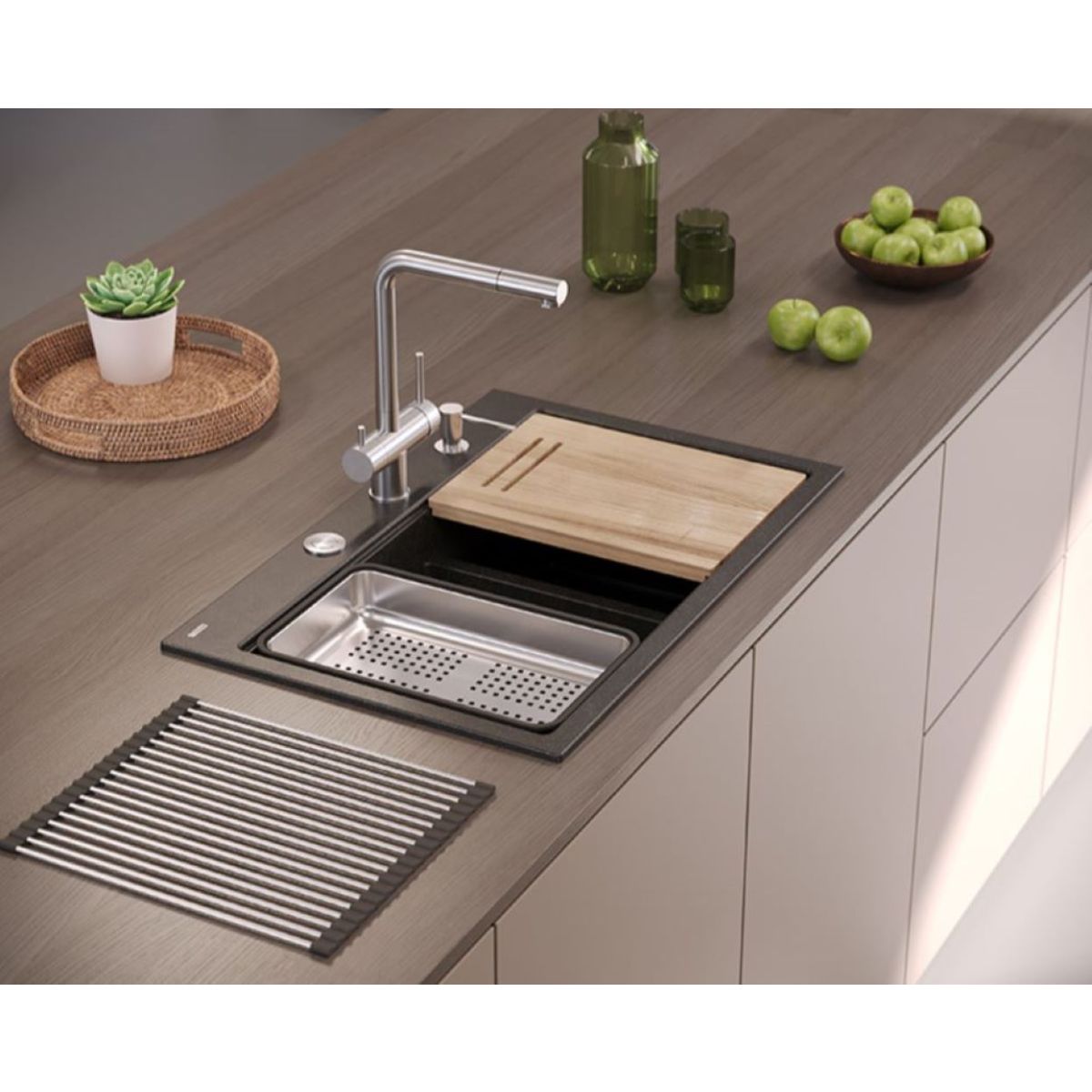 Il bordo appositamente progettato consente l'utilizzo di accessori funzionali Nella variante con rubinetteria in acciaio: tagliere in frassino, tappetino e scolapiatti. I lavelli con rubinetteria rivestita in PVD ricevono due accessori funzionali, ovvero una tavola solida e un gocciolatoio. Con queste aggiunte, la zona di lavoro viene notevolmente ampliata, aumentando il comfort del lavoro da svolgere.