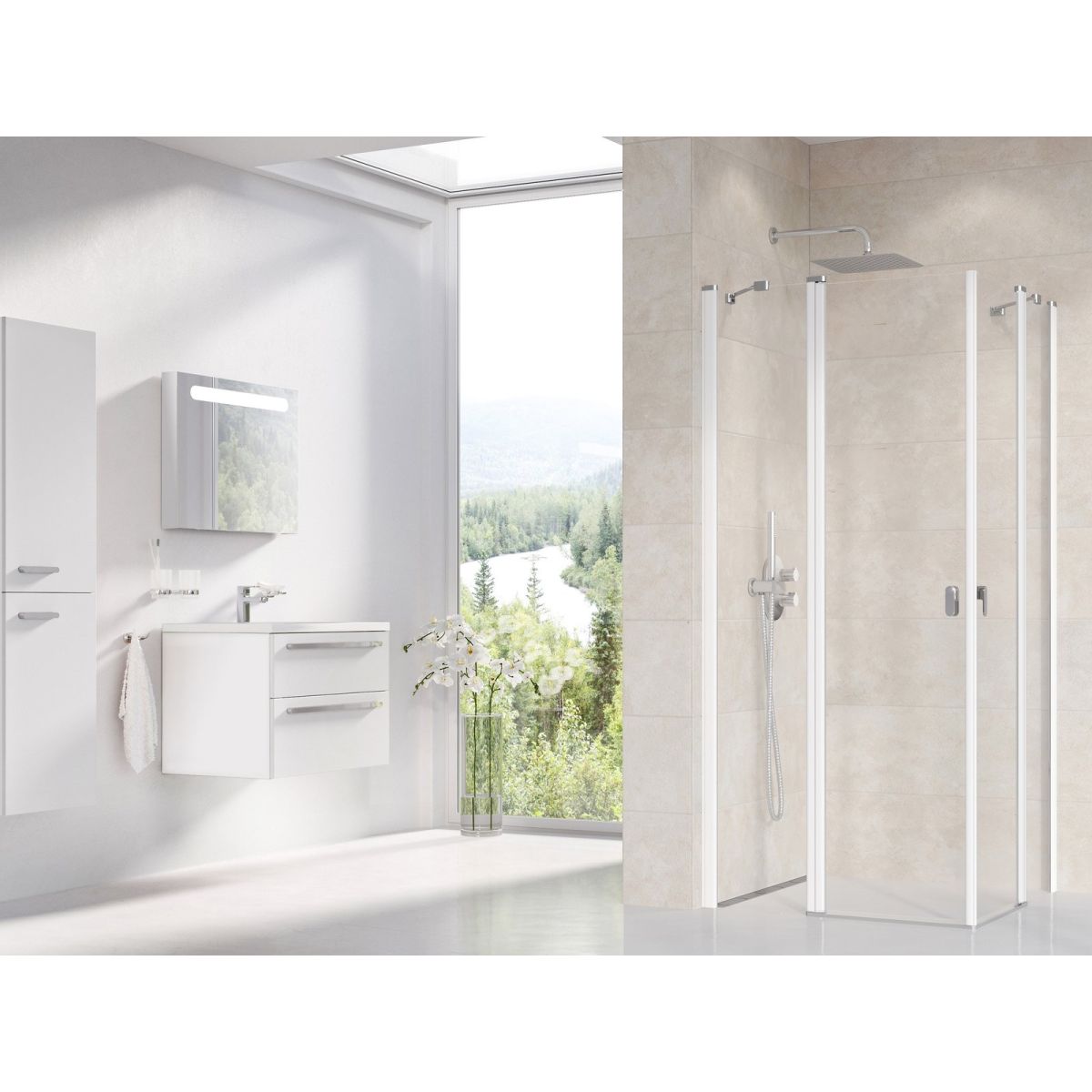 Metà della cabina doccia angolare Chrome in versione bianca con pannello in vetro trasparente con rivestimento protettivo Ravak AntiCalc®. Per creare la cabina completa, combinare con CRV1, CRV2 o CPS. Sistema di apertura a cerniere.