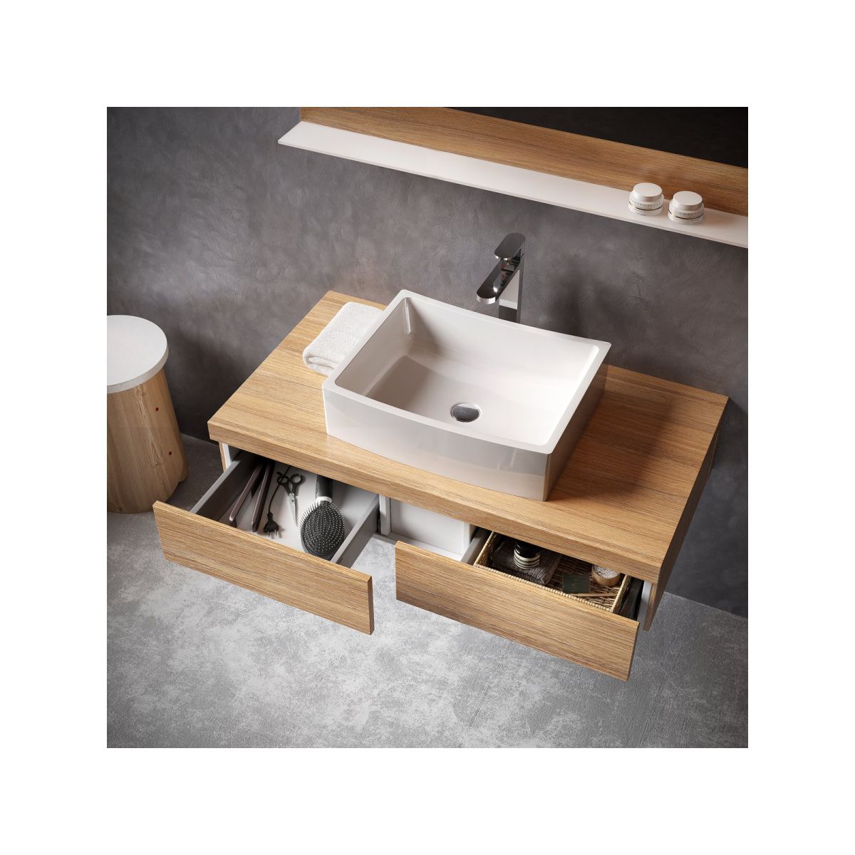 Il mobile con piano offre spazio non solo intorno al lavabo, ma anche sotto di esso. I cassetti possono contenere tutto ciò che non deve essere lasciato in vista. Il mobile alto può contenere tutto ciò che è indispensabile in bagno e lo specchio offre ulteriore spazio sul ripiano in vetro.