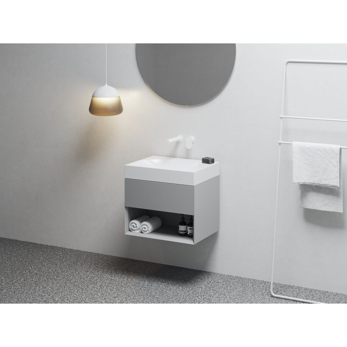 Il lavabo Lite 60 non è dotato di troppopieno, pertanto, per evitare il traboccamento, è necessario utilizzare un telaio fisso per lavabo. Il lavabo è progettato per essere abbinato a un rubinetto da incasso. Il set include un kit di montaggio (tasselli, viti, ecc.). Può essere montato a parete o completato con il mobile sottolavabo SD Lite 60.