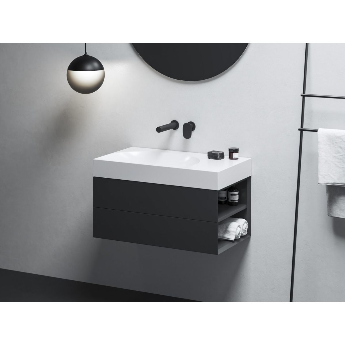 Lavabo Lite 80/60 P con spazio di contenimento sul lato destro. Il lavabo non è dotato di troppopieno, quindi per evitare il traboccamento è necessario utilizzare un porta lavabo fisso. Il lavabo è progettato per essere abbinato a un miscelatore da incasso per lavabo. È incluso un kit di montaggio (perni di collegamento, viti, ecc.). Può essere montato a parete o completato con un mobile lavabo SD Lite 80 o SD Lite 80 P.