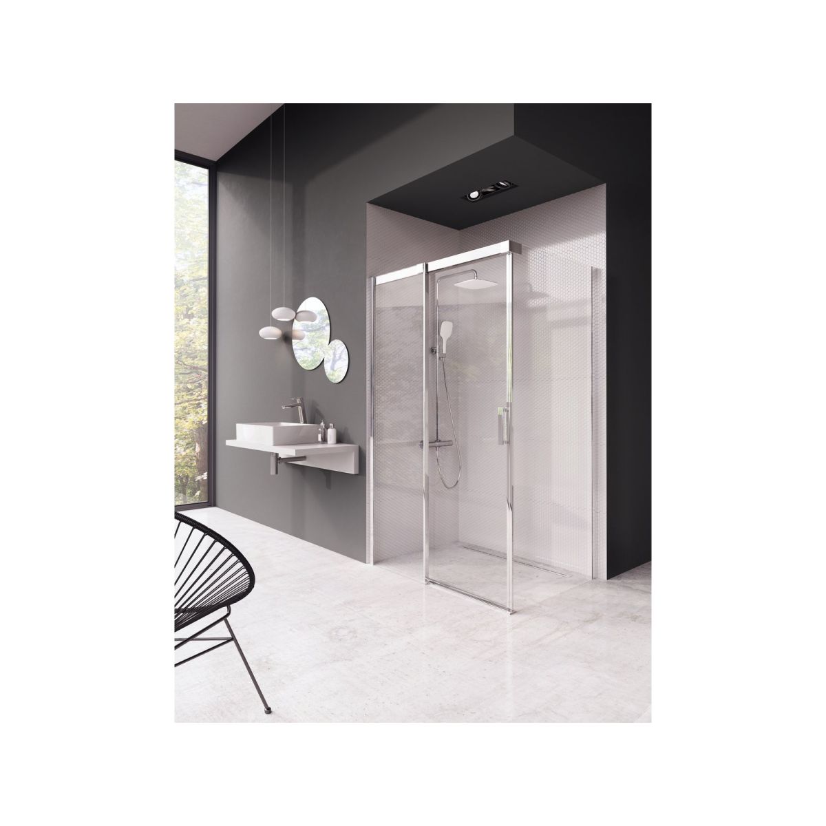 Cabina doccia angolare Matrix in finitura cromata lucida con pannelli in vetro trasparente con rivestimento protettivo Ravak AntiCalc®. Sistema di apertura scorrevole. Variante sinistra.