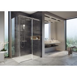 Cabina doccia angolare Matrix in finitura cromata lucida con pannelli in vetro trasparente con rivestimento protettivo Ravak AntiCalc®. Sistema di apertura scorrevole. Variante destra.