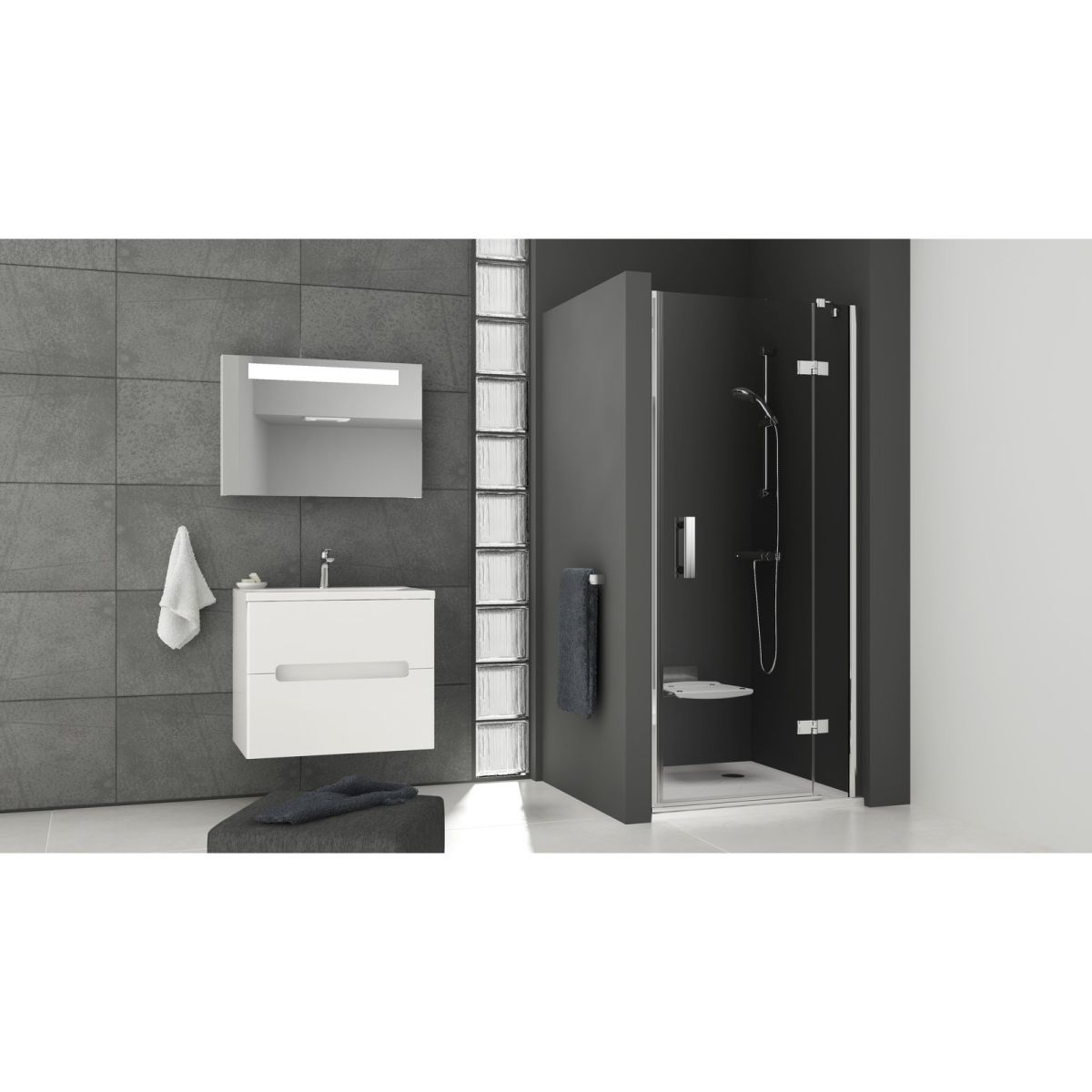Porte doccia a due ante SmartLine in finitura cromata lucida con pannello in vetro trasparente con rivestimento protettivo Ravak AntiCalc®. Sistema di apertura a cerniere. Versione destra.