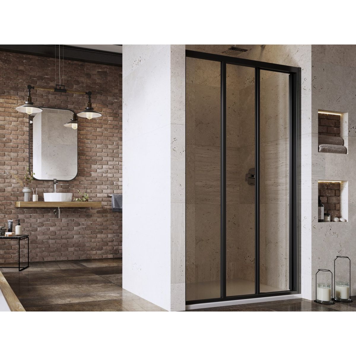 Porte doccia Supernova a tre ante con finitura nera e pannelli in vetro trasparente con rivestimento protettivo Ravak AntiCalc®. Sistema di apertura scorrevole. Il prodotto non è disponibile nelle versioni destra e sinistra.