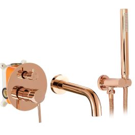 Comprende: rubinetto con deviatore, bocca di erogazione per vasca, doccetta, flessibile doccia, prese d'acqua