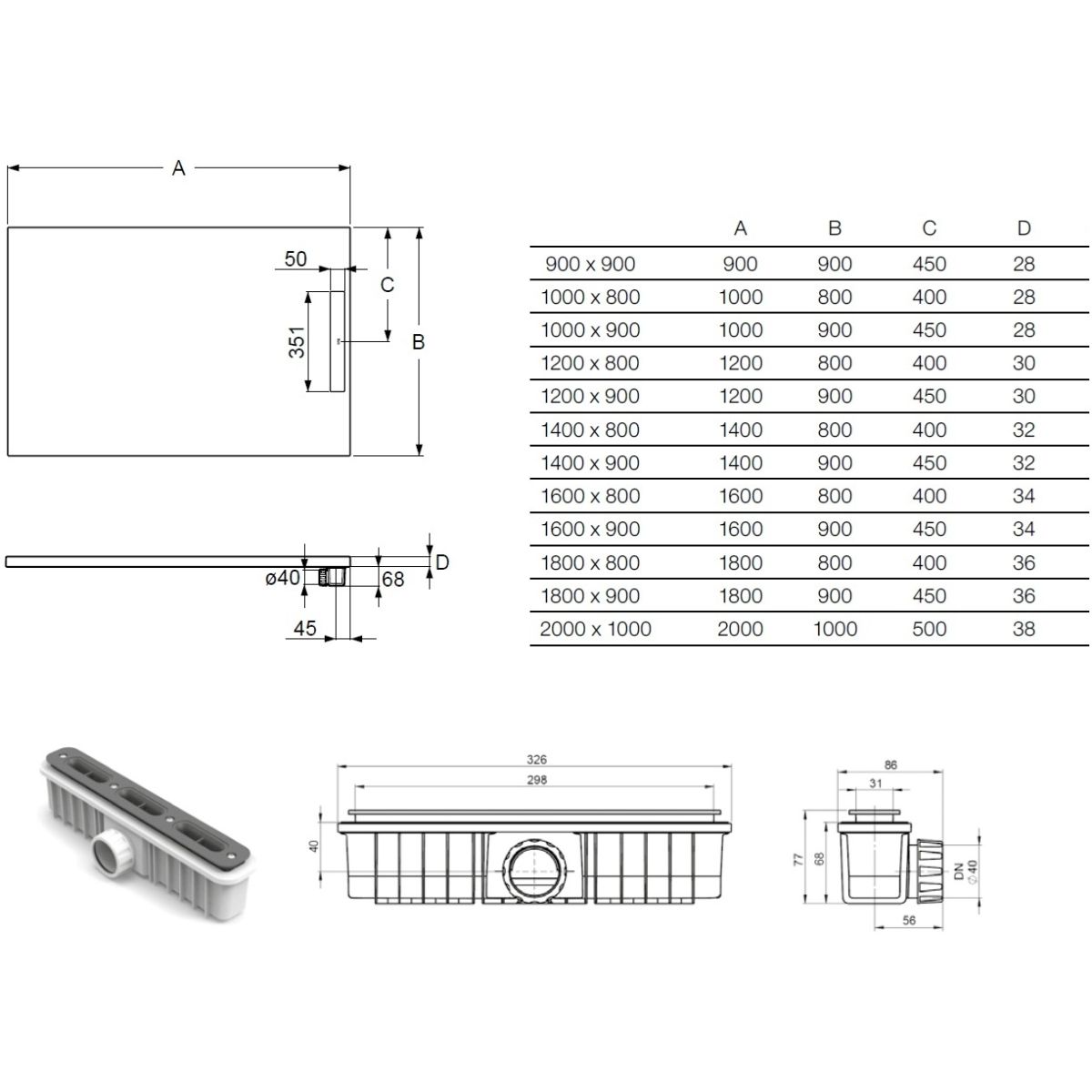 - altezza del sifone dal fondo del piatto doccia: 68 mm