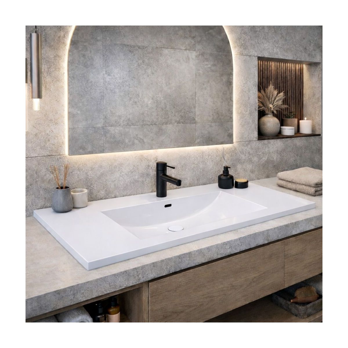 - Il materiale DOLOSTONE è ottenuto dalla combinazione di 80% di roccia dolomitica naturale e 20% di resina polimerica di alta qualità. Tale combinazione garantisce una resistenza eccezionale, stabilità strutturale e resistenza ai danni meccanici. Ogni lavabo è inoltre rivestito con uno strato di gelcoat sanitario che protegge la superficie dall'umidità, dallo sporco e dai raggi UV.
