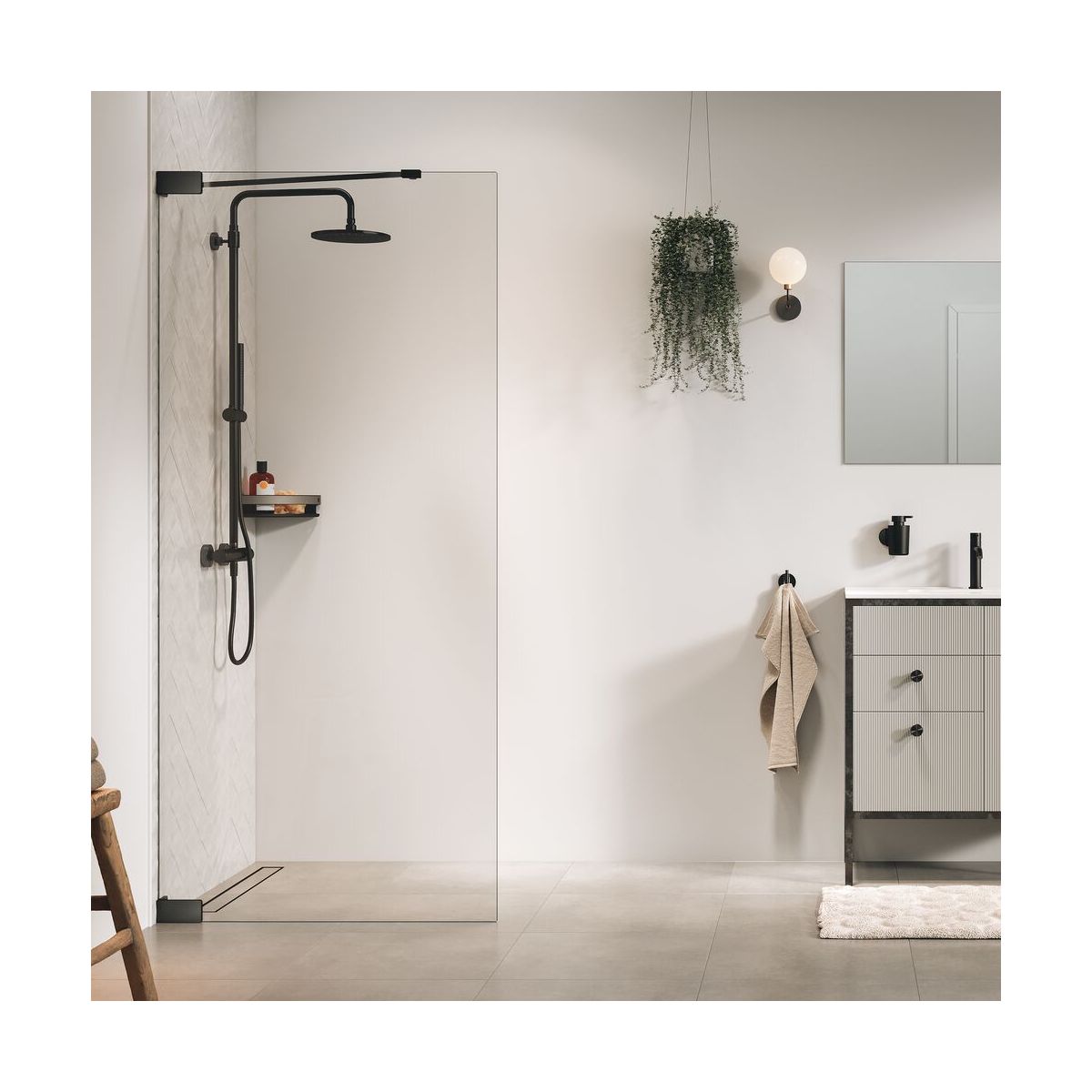 Aggiungete un ulteriore comfort al vostro bagno con la cabina doccia Sealskin Pure. Con una larghezza di 88 cm e un'altezza di 200 cm, questa cabina doccia offre la massima chiarezza e dettagli raffinati. Gli elementi di fissaggio in acciaio inox di alta qualità garantiscono un collegamento piatto al vetro di sicurezza di 8 mm di spessore con rivestimento anticalcare. Questo mantiene il vetro pulito e lo rende facile da pulire dopo il bagno. Chi non lo vorrebbe? La cabina doccia è dotata di una barra di stabilizzazione che può essere montata a qualsiasi angolo o perpendicolare al vetro. La sezione centrale in alluminio può anche essere facilmente accorciata. La barra stabilizzatrice e i morsetti per il vetro sono rifiniti in grigio spazzolato per un look sofisticato ed elegante in bagno.