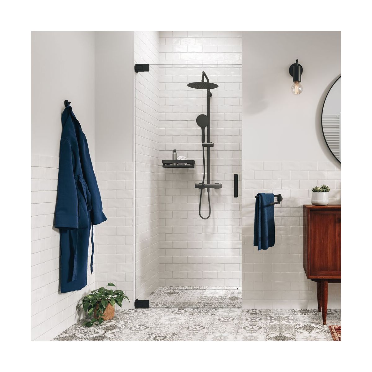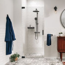 Aggiungete un ulteriore comfort al vostro bagno con la porta a battente Pure per l'alcova. Grazie al suo design minimalista, il bagno appare subito spazioso e aperto. La porta, larga 79,5 cm e alta fino a 200 cm, offre maggiore calore e comfort durante il bagno. I fissaggi in acciaio inox di alta qualità assicurano un collegamento piatto al vetro di sicurezza di 8 mm di spessore con rivestimento anticalcare. Questo mantiene il vetro pulito e lo rende facile da asciugare dopo il bagno. Chi non lo vorrebbe? Questa porta a battente può essere aperta verso l'interno o verso l'esterno ed è dotata di un sistema di chiusura automatica per facilitare la chiusura. Le cerniere e la maniglia sono rifinite in nero opaco. Una finitura audace che si sposa bene con molti stili di bagno.