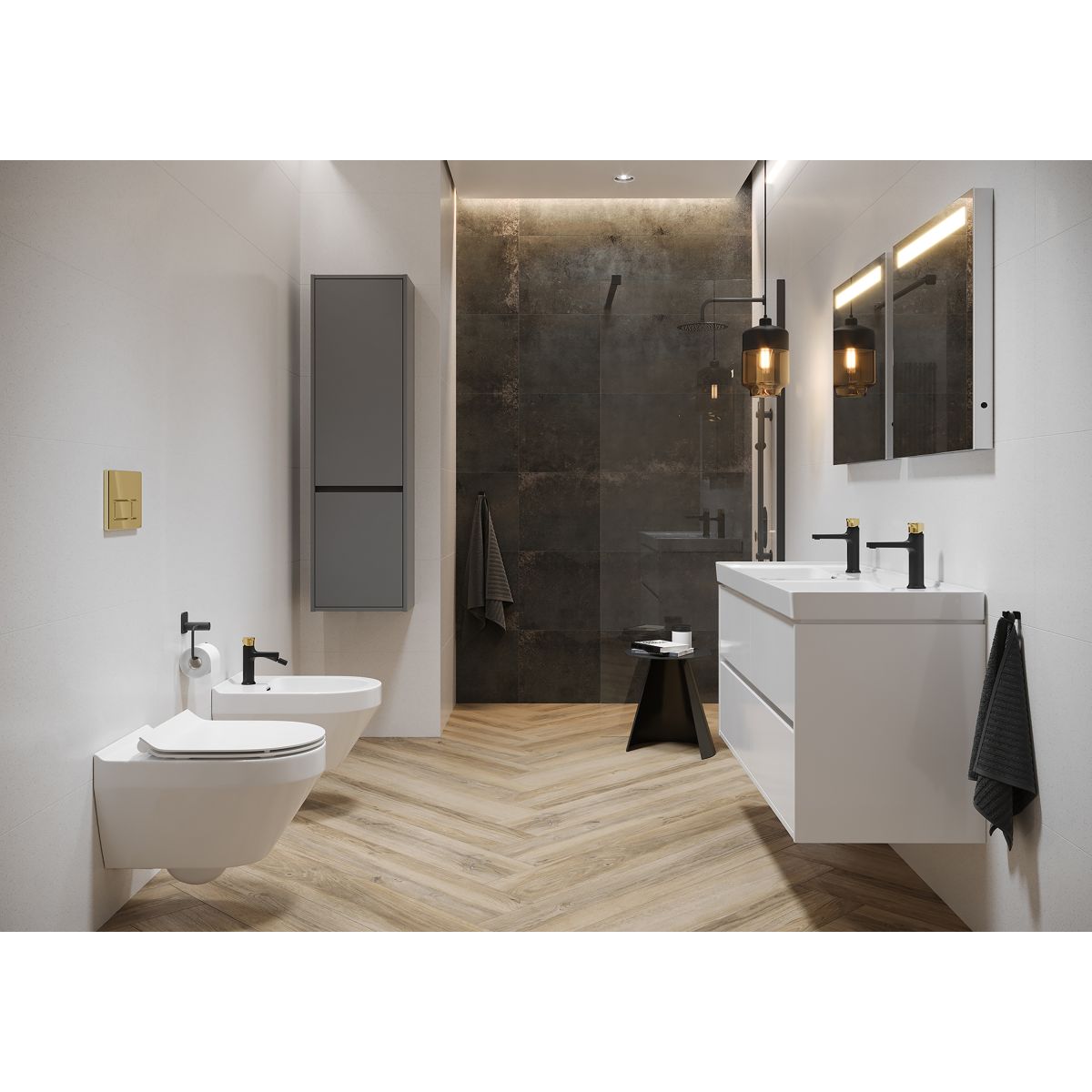 Il set comprende un mobile sospeso CREA 100 con un lavabo d'arredo CREA 100. Il frontale e il corpo del mobile sono realizzati in truciolato bianco resistente all'umidità. Il mobile è dotato di un sistema di apertura a sfioramento (il cosiddetto PUSH SYSTEM) e di due capienti cassetti. L'interno con trama di lino grigio conferisce al mobile un aspetto particolarmente elegante. Il lavabo CREA è realizzato in ceramica ROCKLITE, che lo rende sorprendentemente resistente, leggero e con pareti estremamente sottili.